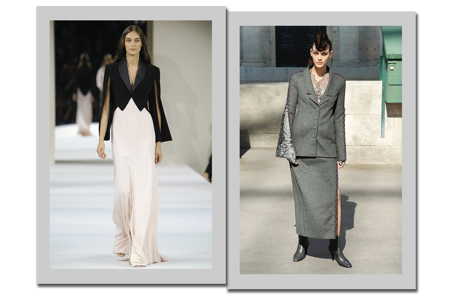 Com fenda ou não, as bell sleeves foram as escolhidas como protagonistas. Karl Lagerfeld trabalhou a abertura de forma gradual, revelando o forro de chiffon de seda acolchoado e costurado à mão para se assemelhar à assinatura da maison Chanel. A Alexis Mabille apostou na repaginação do smoking encurtado, com manga presa apenas nos ombros.