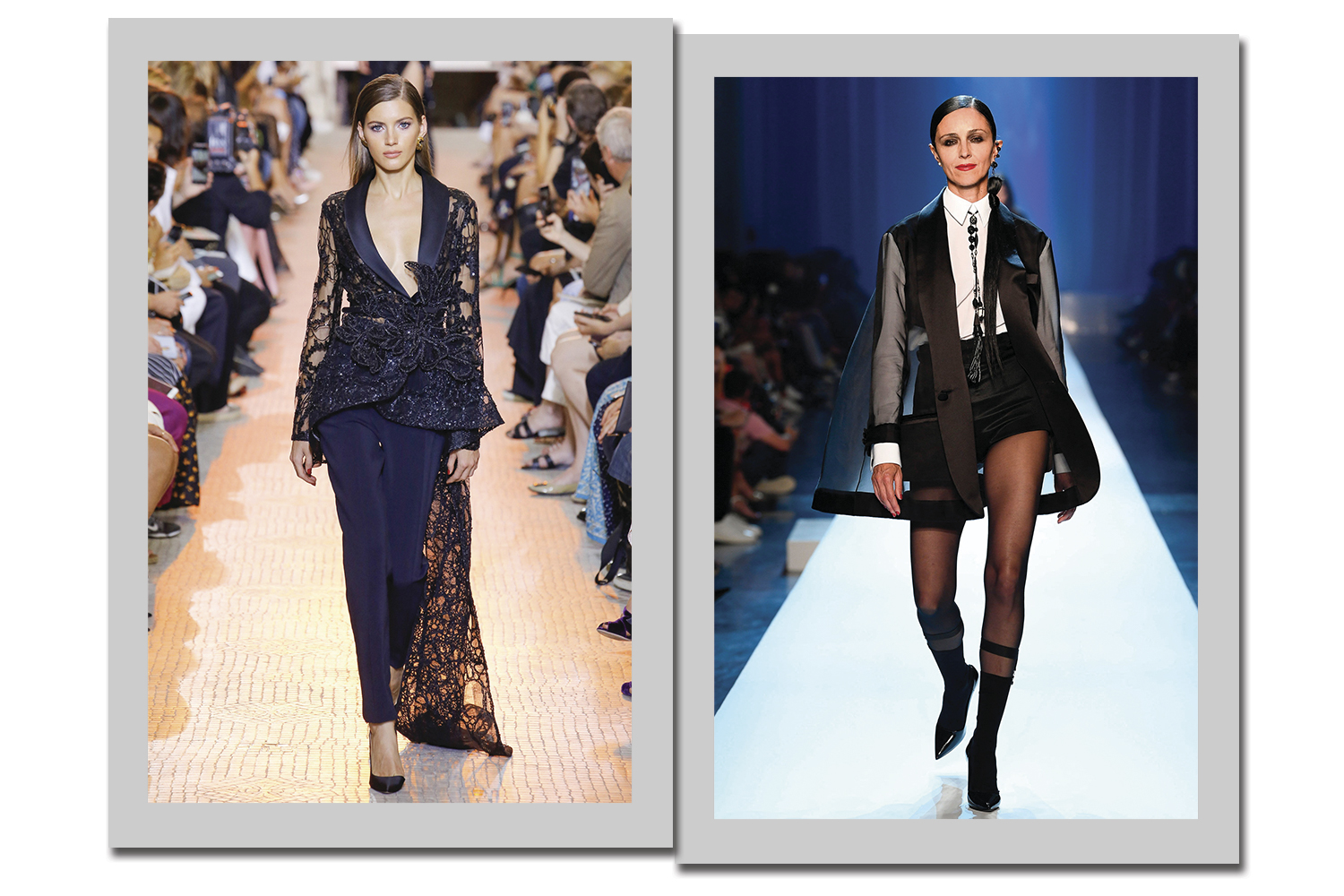 As transparências também apareceram em dois momentos. A luxuosa Elie Saab investiu nos seus requintados bordados aplicados nas mangas de organza, superdelicadas e com brilho contrastante na mesma cor marinho do smoking. Já na passarela de Jean Paul Gaultier, a década de 1980 vem com toda força, e o casaco aparece como elemento moderno do visual à la garçonne – a modelagem oversized evidência uma proposta boyish ousada da época.