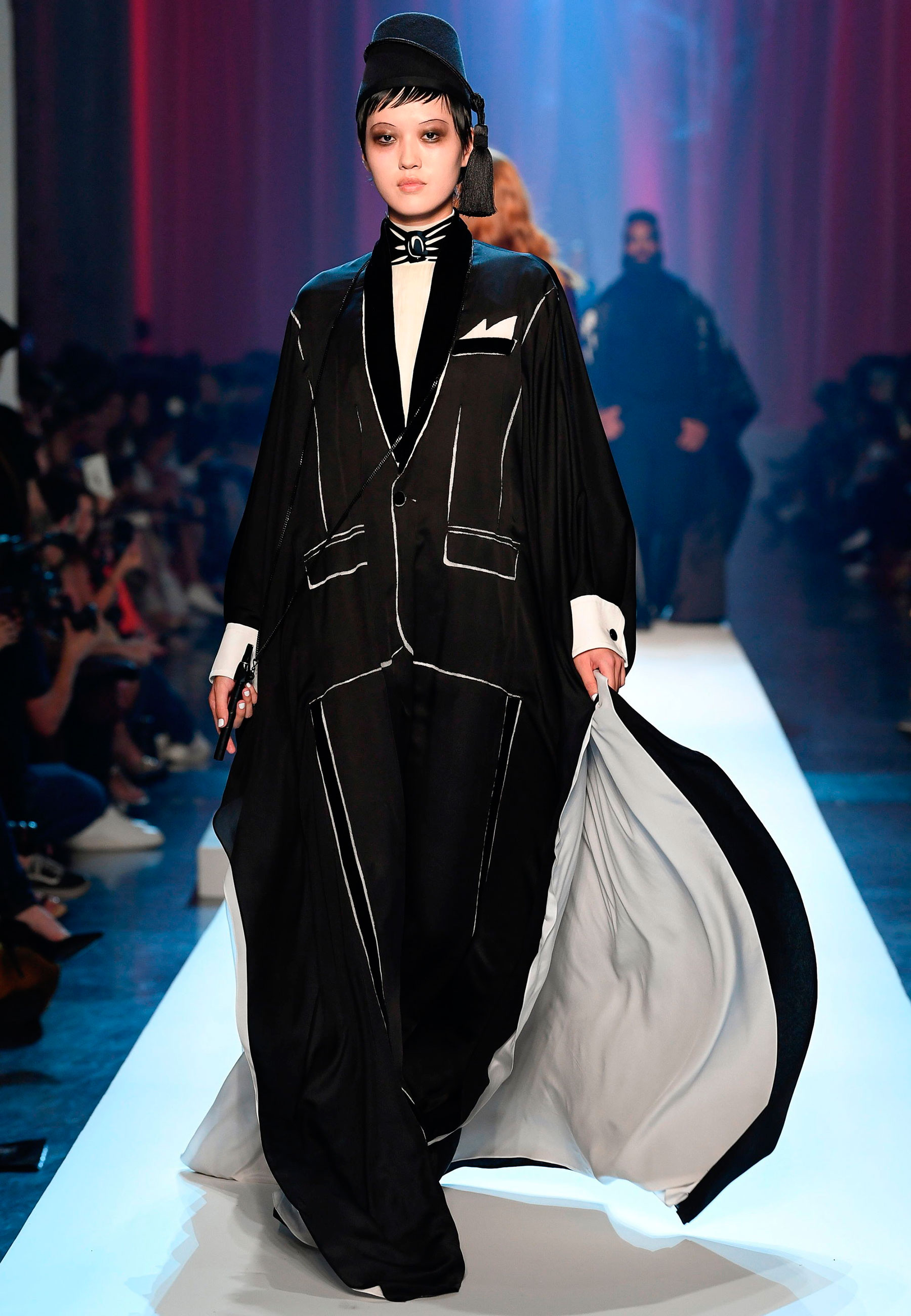 Na Jean Paul Gaultier, o efeito trompe l’oeil, que traz truques de perspectiva e cria ilusões de ótica, cobriu o vestido o all black com rabiscos que parecem feitos de giz de alfaiate para marcar bolsos, lapelas e cortes.