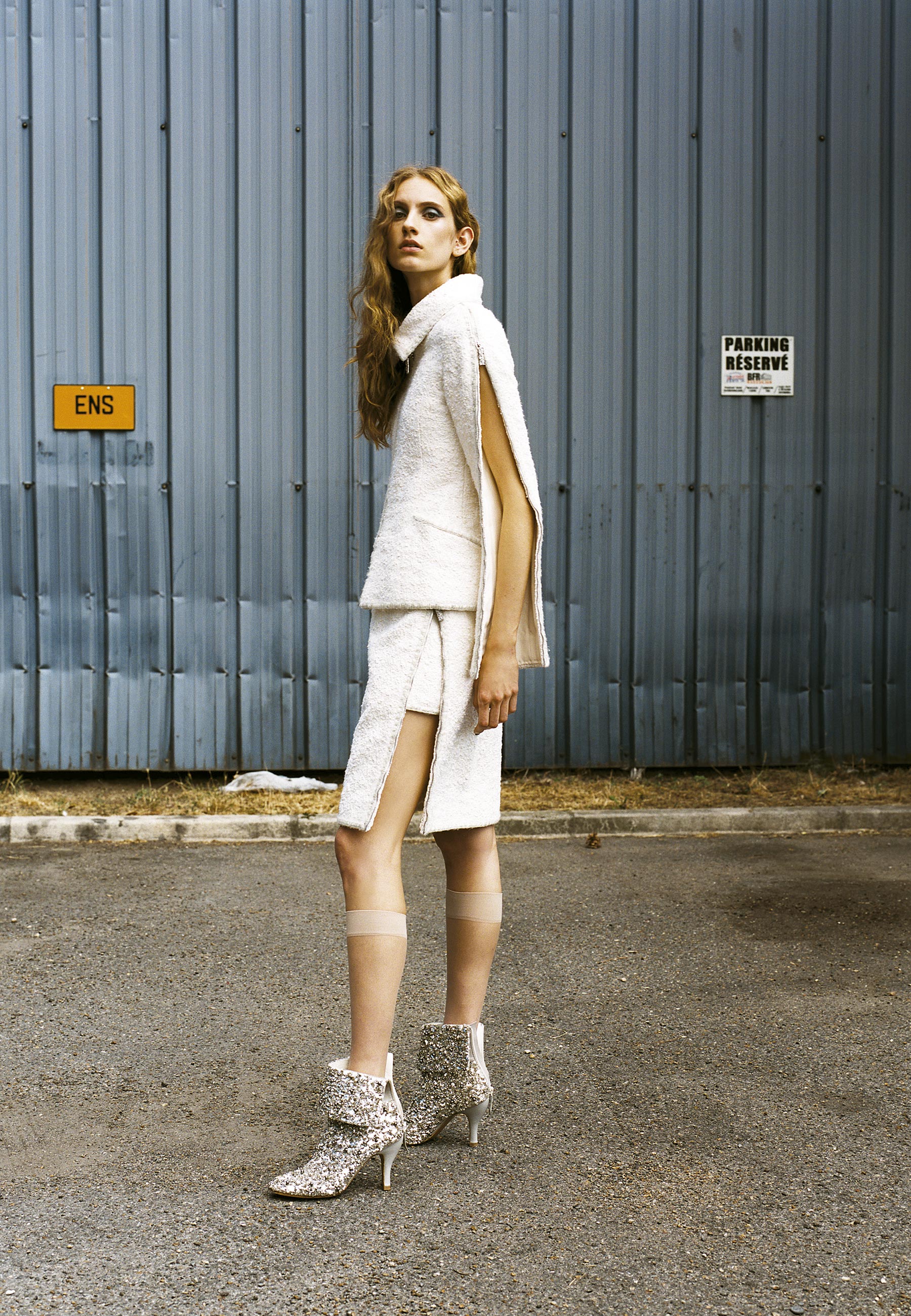 Sarah Berger (WAY) veste casaco e saia de tweed com zíper e botas com aplicações – Foto: Stépanhie Volpato, com styling de Arthur Mayadoux