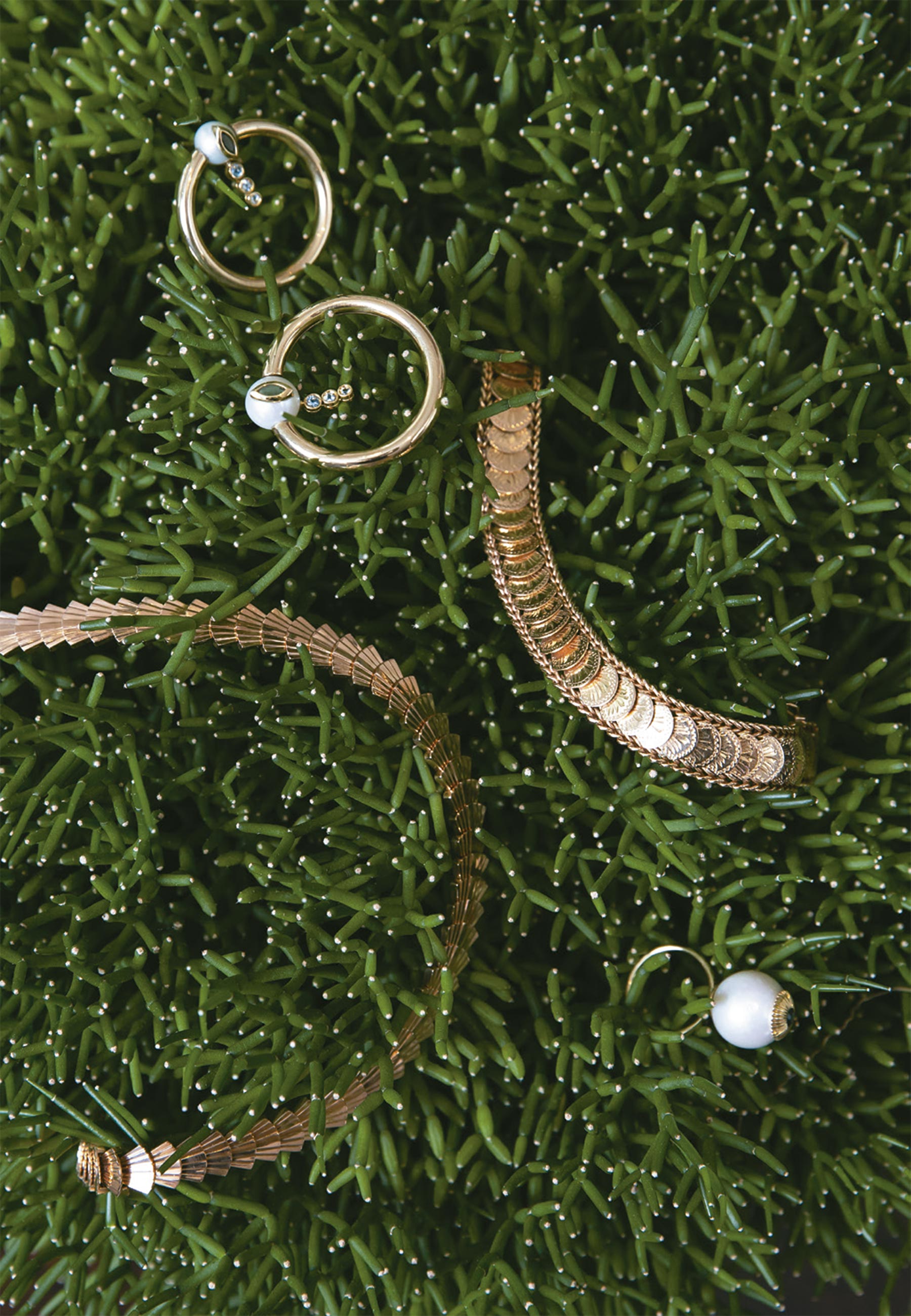 Brincos, colar e anel Andrea Colli Gem e pulseira de ouro herdada do avó – Foto: Vinicius Postiglione, com edição de moda Rodrigo Yaegashi