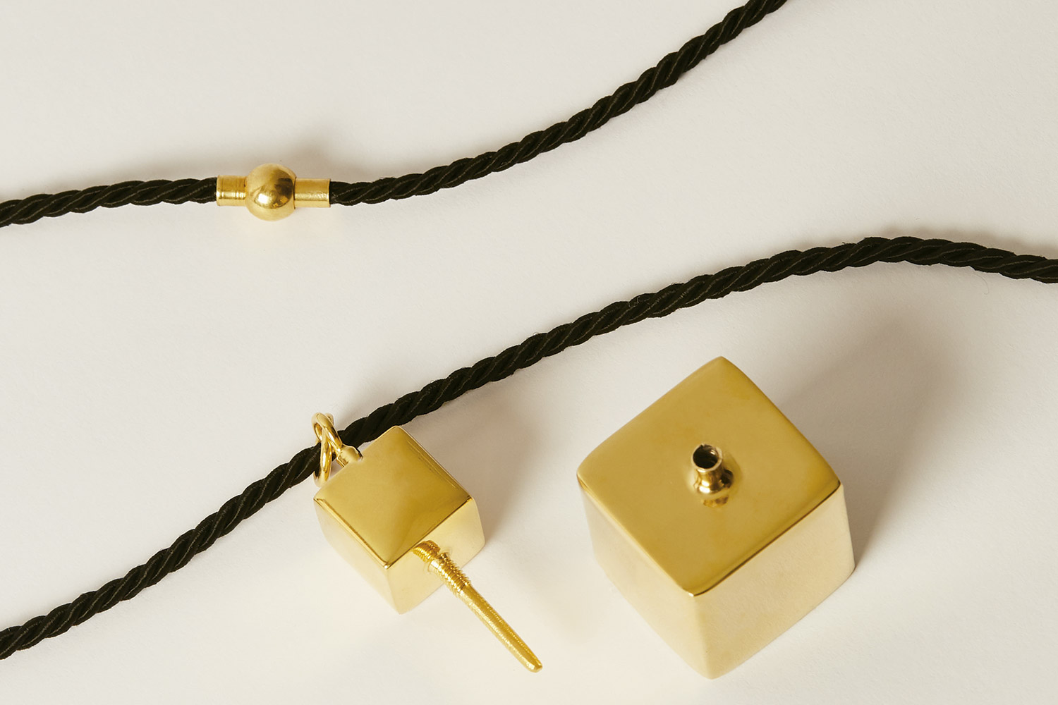 Pendente aberto e funil para encher o frasco com perfume Tisk, em alpaca com banho de ouro rosa – Foto: Divulgação