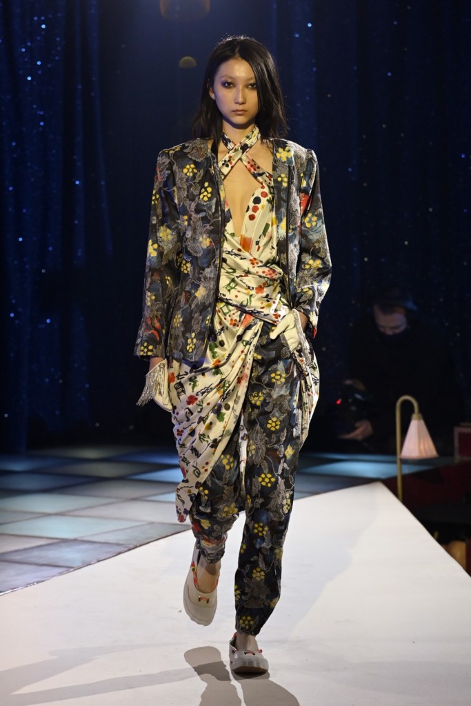 A coleção é carregada de referências aos palcos, às artes e à trajetória disruptiva de Westwood. Mas fica claro o desejo de Kronthaler de homenagear o mundo do teatro em adição com seu desejo de expressar leveza e sua busca por encontrar sua musa dentro de si, como o próprio designer afirma nas anotações sobre a apresentação.
