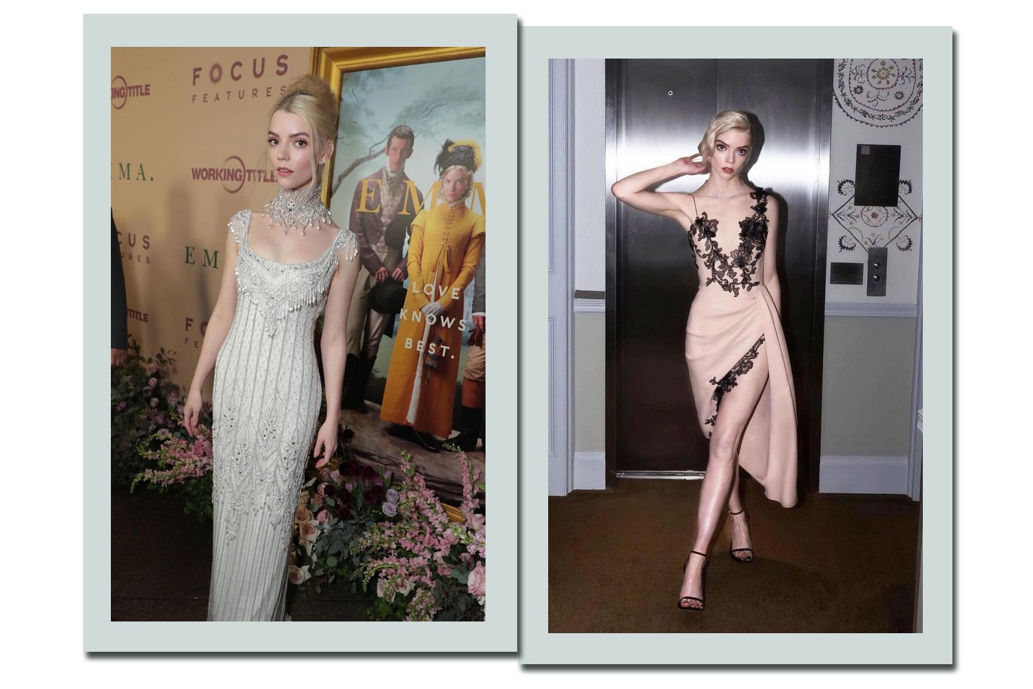 Assim como já participou de produções de época, Anya gosta de incluir referências vintage ao seu visual. Para a premiere de “Emma” em Los Angeles, a atriz optou por um lindíssimo vestido vintage de Bob Mackie com uma silhueta imperial que faz referência ao momento de transição de estilos no filme que ela estrela.