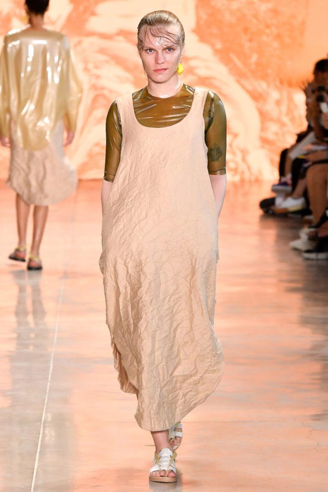 E, também, determinada e organizada. Para a nova coleção, evoluiu no trabalho com elástico, que deu o tom do último desfile, e foi além, acrescentando barbatanas e látex. A transferência das formas do corpo fora da silhueta tradicional continua sendo o carro-chefe para a construção de volumes com peso de estranhamentos. Este ano, a estilista conheceu Raphaela Mehlson, artista visual paulistana radicada em Nova York, que trabalha com látex, e se encantou com o processo. “Ela fez uma variação texturizada a partir de uma base de gesso que adorei. Então, quis usar essa versão, além de uma plana e outra moldada sobre o corpo.”