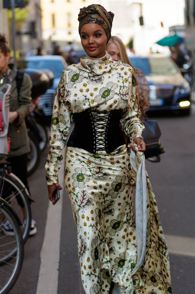 Acima, o vestido floral foi arrematado pelo corselet all black: além de modelar o corpo, ele adiciona um twist inesperado no visual. Desta maneira, o poder feminino e a sensualidade resultam em look repleto de informação de moda.
