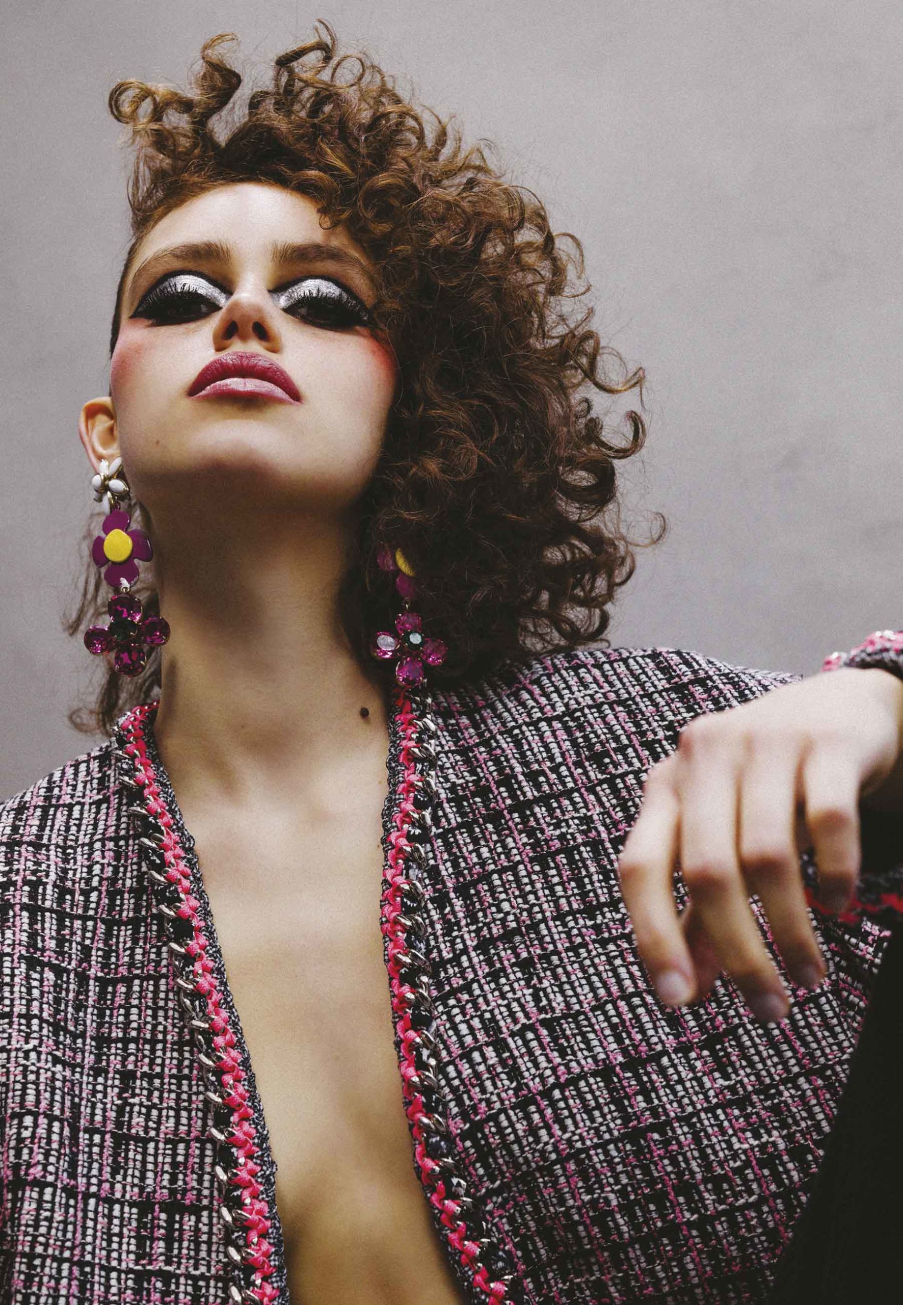 Caroline Reuter (Oui Management) usa look total Chanel e brincos Saint Laurent por Anthony Vaccarello – Foto: Stéphanie Volpato, com styling de Sarah Cazeneuve, maquiagem de Tiziana Raimondo e cabelo de Tomoko Ohama