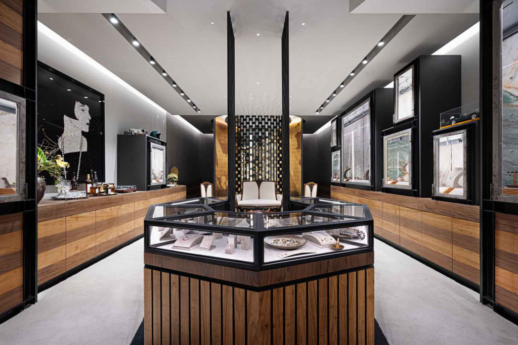 O espaço foi concebido em tons sóbrios, combinando estruturas em madeira nogueira e freijó com preto, cinza e branco. A pedra natural é um dos elementos mais marcantes, com paredes em crystal quartz e papel de parede pintado e bordado à mão da De Gournay.