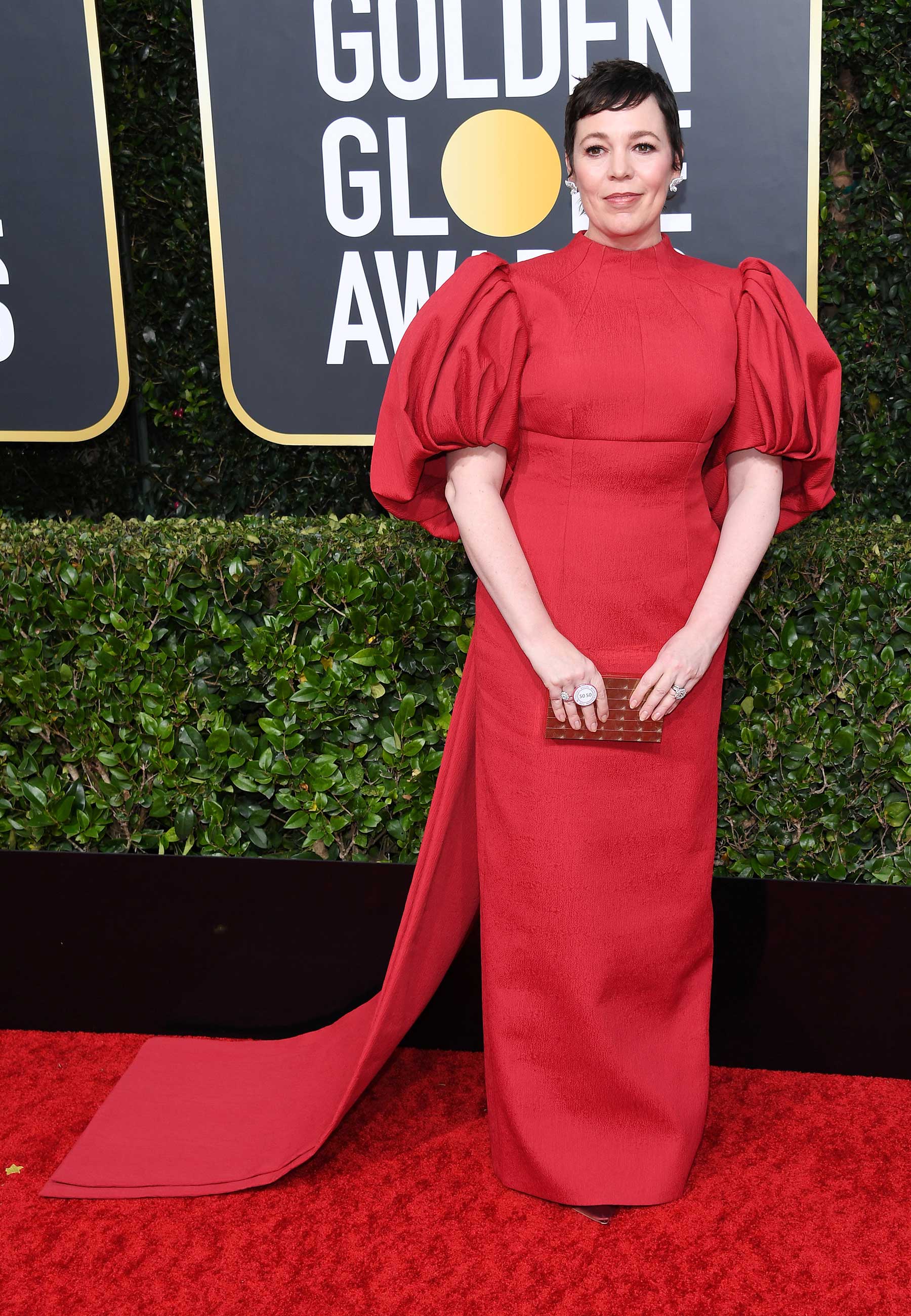 Olivia Colman, a atual rainha Elizabeth II na série “The Crown”, também aposta nas mangas bufantes para o seu vestido vermelho da também britânica Emilia Wickstead.
