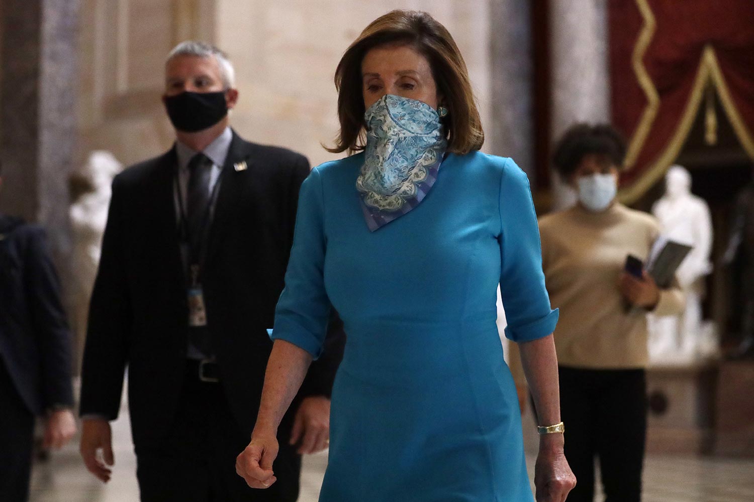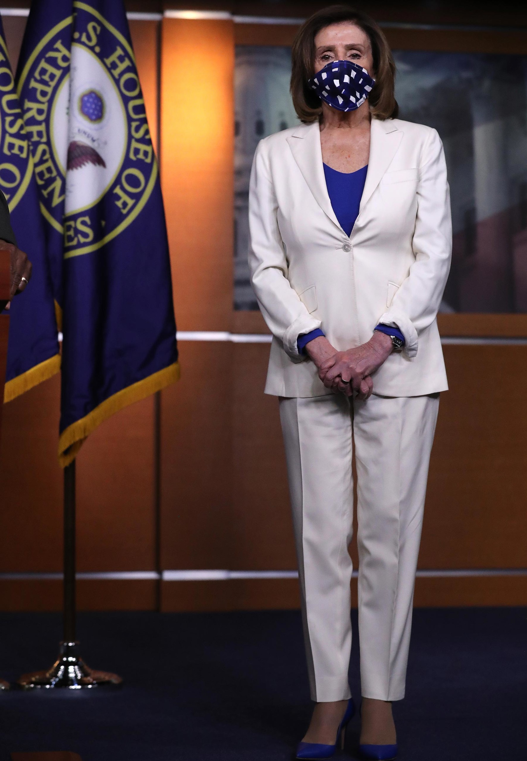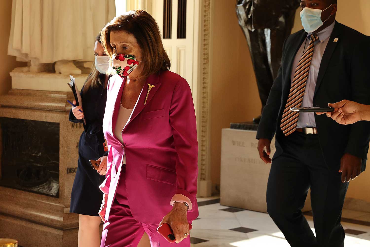 Terninho fúcsia, sapatos vinho e uma máscara com estampa de cereja – pareando exatamente com o tom de seu calçado. Foi assim que a política norte-americana adentrou o Capitólio para lutar pela aprovação do projeto de auxílio de US$ 3 trilhões para reduzir os impactos econômicos da pandemia em todo o país.