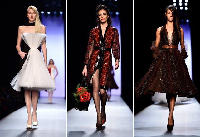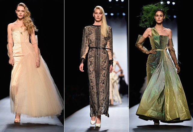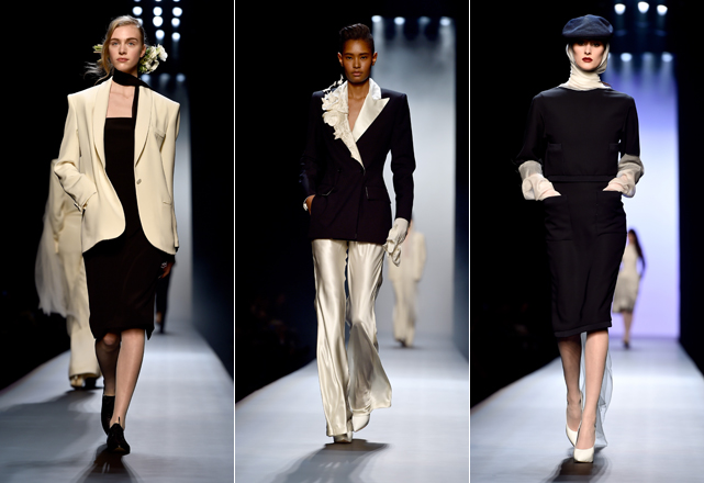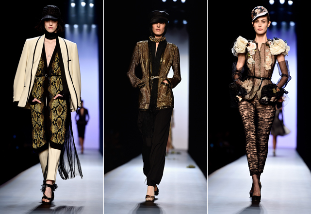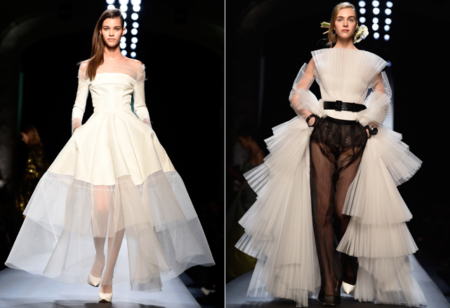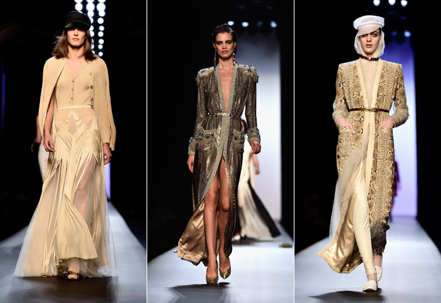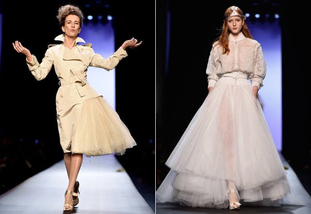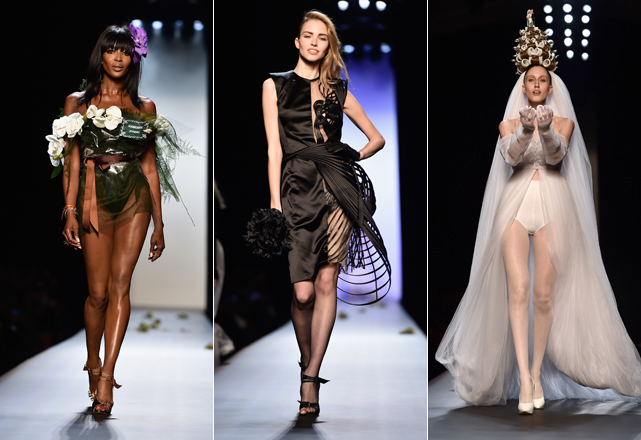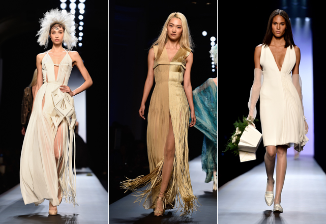 Jean Paul Gaultier apresentou na tarde de hoje (28.01) sua coleção Spring Summer 2015 na semana de Alta-costura, em Paris. Dedicado às noivas, o estilista trouxe a versatilidade da ocasião em tuxedos ultra sexy e vestidos midi, com ares sessentistas. As barras volumosas acompanham silhueta acinturada que são contrapostos com os looks de shape slim e fendas estratégicas. Confira os looks da nossa galeria: