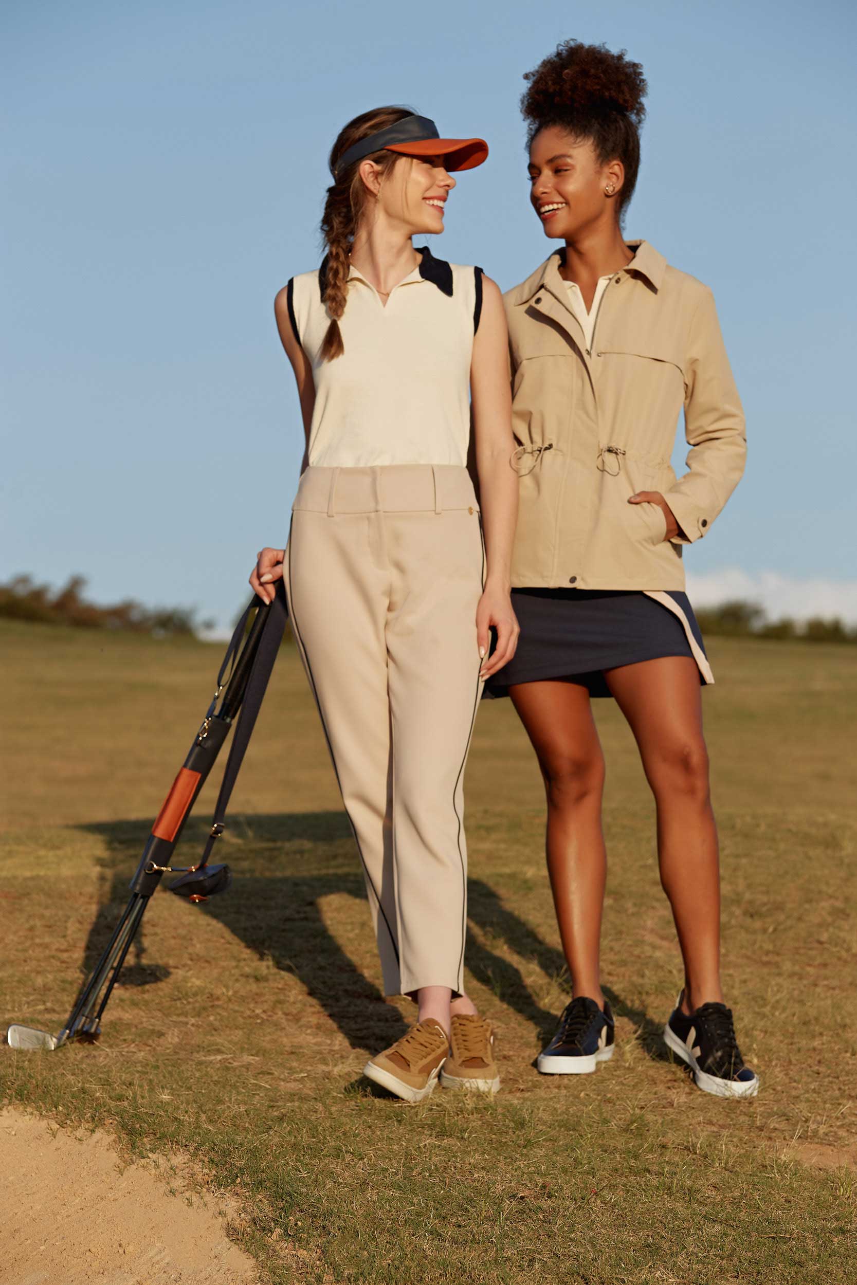 A paleta de cores passeia por tons terrosos, azuis, branco, bege, preto e rosa. A marca também tem uma collab especial para o desenvolvimento dos acessórios como bonés, cintos, bolsas, porta-taco de golf, porta-bolas de tênnis, todos em couro natural, com a Le Bloom.