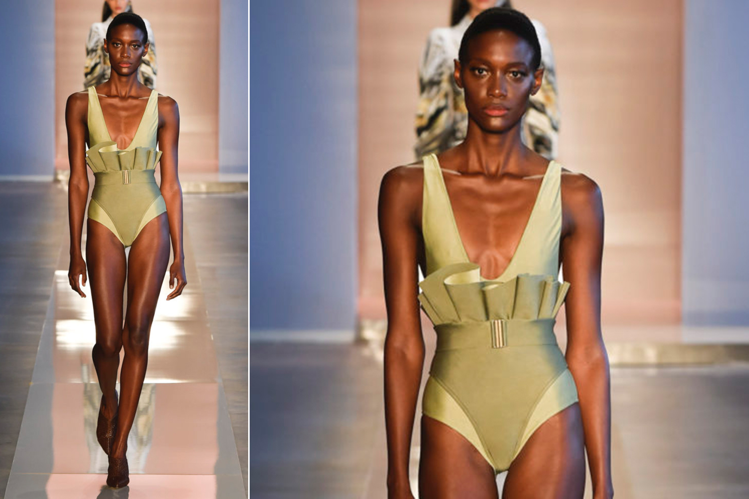 Na coleção do estilista Amir Slama, as ondulações são costuradas como faixas do ombro à cintura, o integram os decotes tipo frente única, cobrindo os seios.