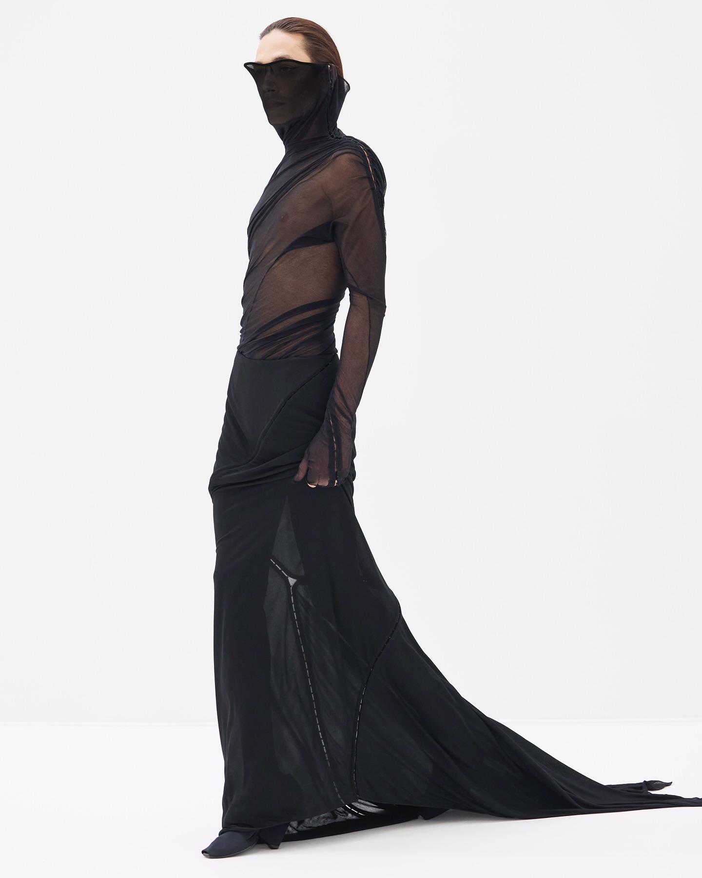 O conceito de transformar roupas “cotidianas” em “alta moda” não é novo para Gvasalia ou para a moda, mas o desfile de alta-costura da Balenciaga reforça esse movimento que definiu uma era. Seu cinismo em questionar todo aquele mise en scène é impressionante. Pode ser com um vestido de papel alumínio ou uma jaqueta jeans, que ganha forro de cetim italiano para preservar seus volumes envolventes. Afinal, a alta-costura é sobre o que está por dentro, né? O que está por fora é questionado ao som de uma meditação guiada que diz: “esteja consciente da marca”.