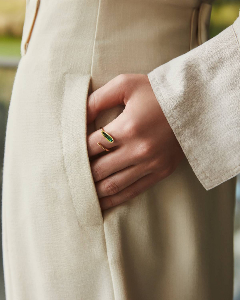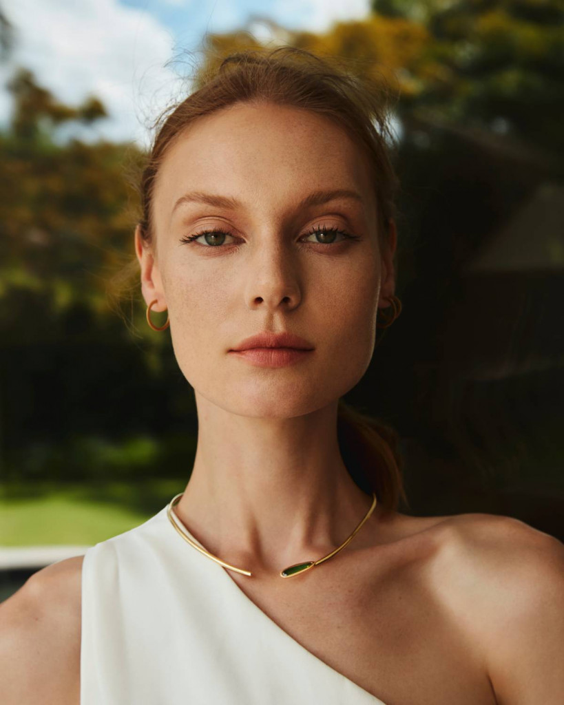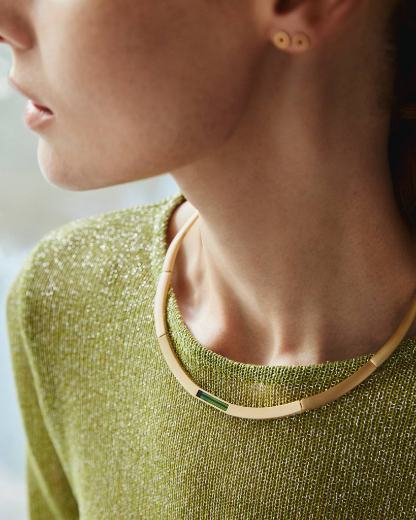 Fundadora da Daslan, Daniela Salles trabalha pela primeira vez com pedras para criação das joais da coleção “RR Bibemus”. De uma forma natural e orgânica, as gemas se integram ao design das peças. Com quase 100% da produção feita com ouro de reuso, Daniela seleciona gemas exclusivas da Cruzeiro Mine, com processo e origens rastreáveis. Diante de uma obra de Paul Cézanne, a designer percebeu que as formas e combinação com o ouro amarelo têm um significado maior para ela. O “Le Rocher Rouge”, por exemplo, apresenta uma pedra em ocre em primeiro plano, assim como o protagonismo do ouro, com pinceladas que formas as folhas verdes. “Essa coleção tem os mesmo códigos da marca, mas com uma energia diferente. Ao trabalhar com pedras, as joias ganharam outra dimensão”, afirma Daniela.