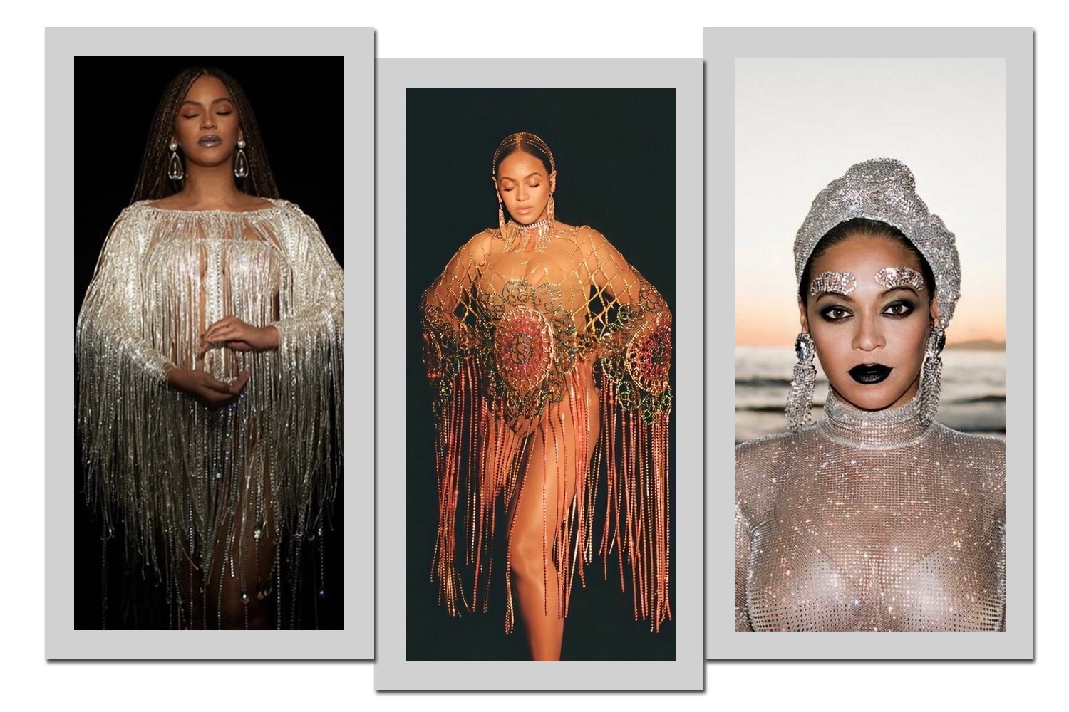 Criando efeitos visuais incríveis, diversas peças usadas no álbum visual tinham muito brilho – seja no material usado ou por serem bordadas. Além disso, os acessórios e, até mesmo, a beleza ganharam versões feitas com cristais. Nas fotos, Beyoncé usa Lace by Tanaya; Area; Alessandra Rich e Laurel DeWitt, respectivamente.