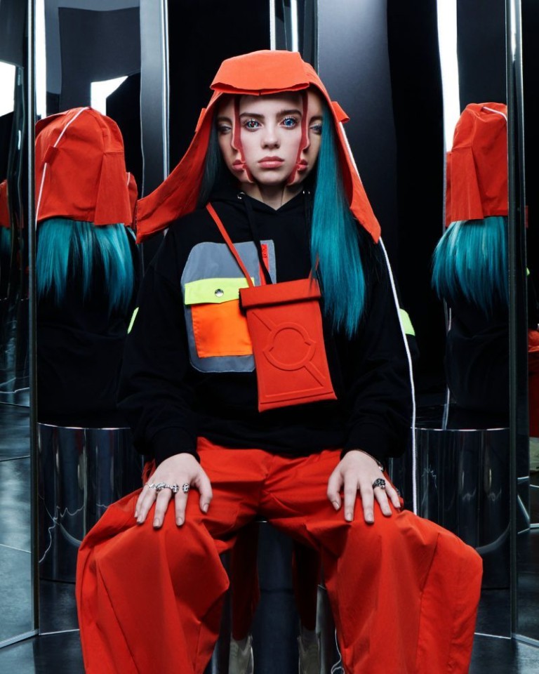 Ainda em tom nostálgico, Billie já aderiu, também, à camisetas e calças oversized com estampas de animes e chapéus bucket – que estiveram muito em alta durante o início dos anos 2000. Além disso, suas roupas contam com um forte contraste de cores, em especial do branco com o neon, que contribuem para deixar o look com um resultado que passe a impressão de ser altamente descolado e, ao mesmo tempo, feito sob medida para chocar.