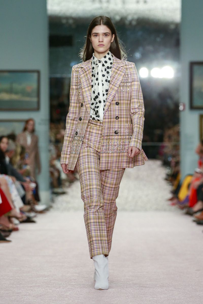 Queridinho do momento, xadrez é a pedida para as fashionistas, inclusive com combo blazer + calça. Para fechar o visual, Carolina Herrera apostou no poá. As aplicações de pedrarias enriquecem o look.