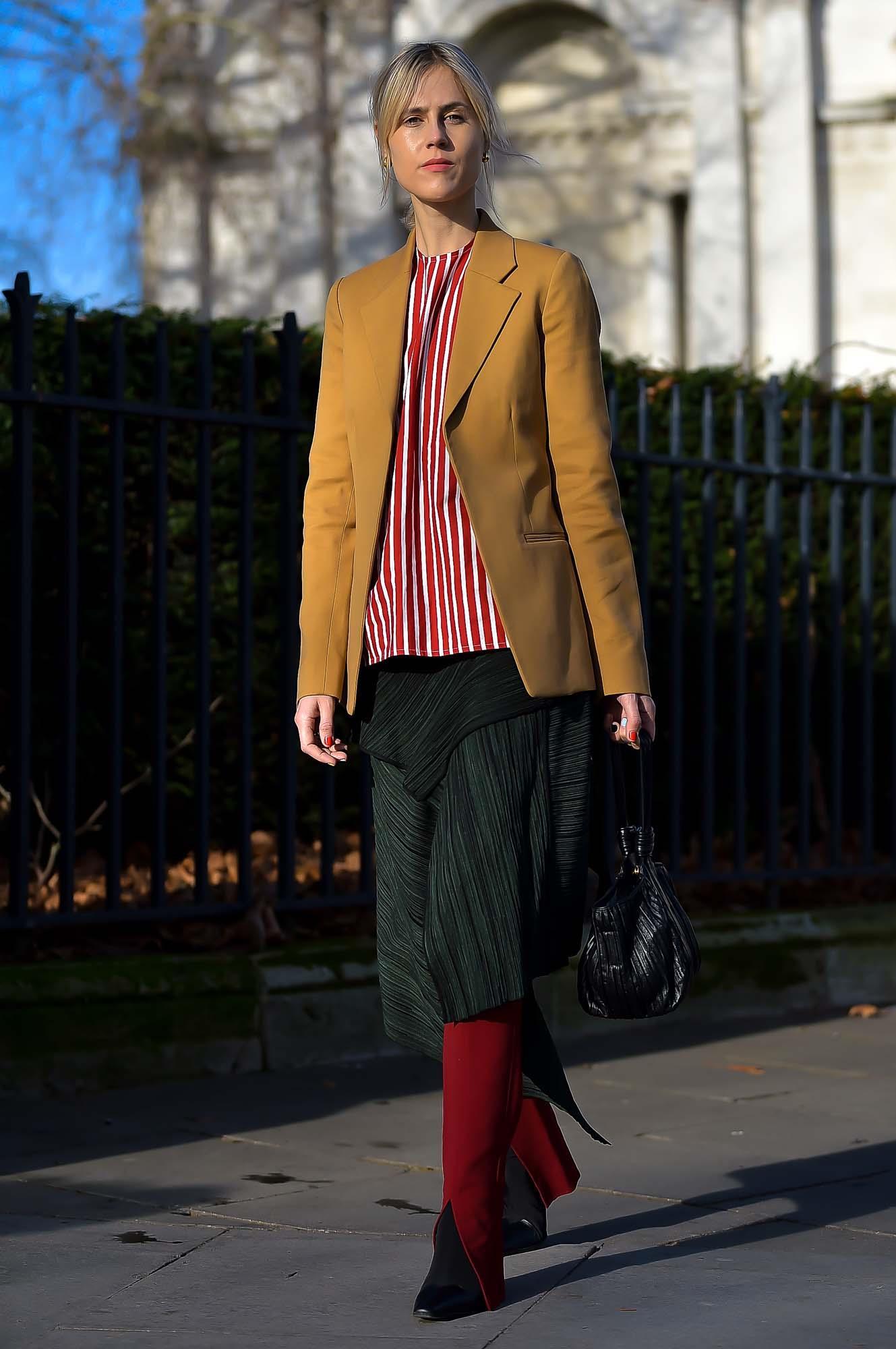 E claro, sempre apostando nas camadas para garantir um visual rico, a saia verde assimétrica foi usada com a calça vermelha por baixo. A blusa listrada alonga o look, enquanto o blazer bege fecha o visual.