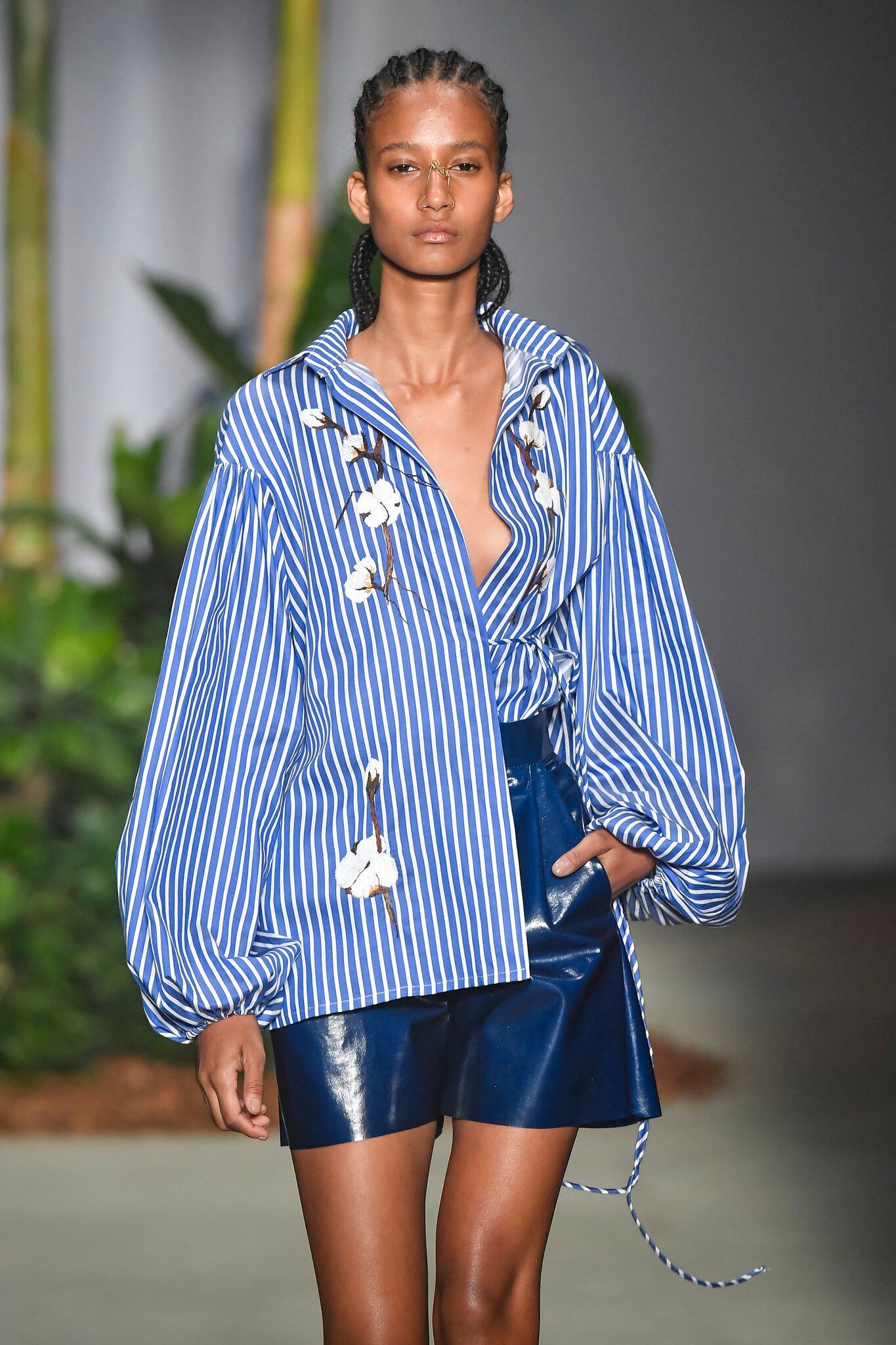 A camisa de seda azul com gola em laço é de Reinaldo Lourenço. O estilista se inspirou no filme “A Garota da Motocicleta” de 1968, com a atriz Marianne Faithfull. Peças no estilo motocross e a mistura dos anos 1960, 1970 e 1990, serviram para a construção do desfile.