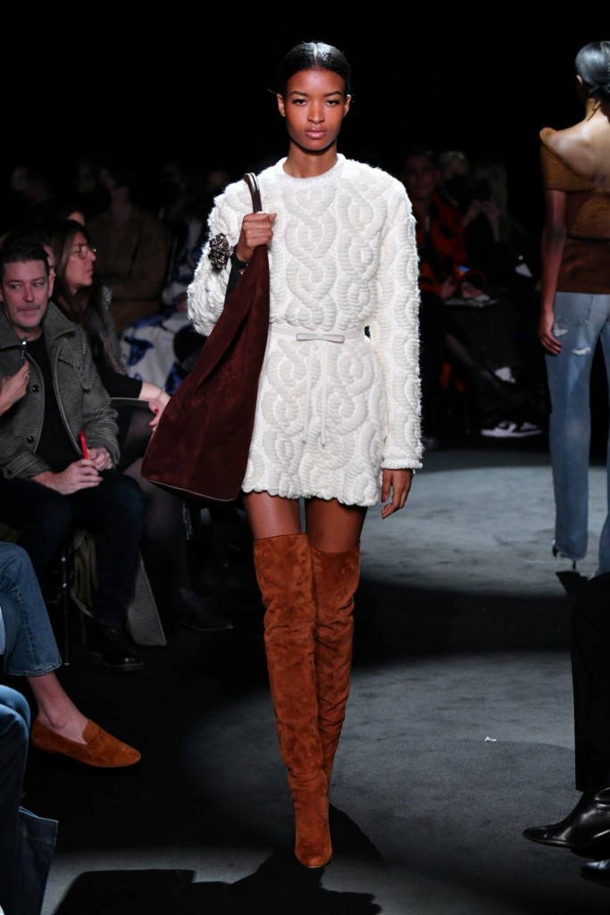 Tricôs combinados com vestidos de festa, a silhueta elegante e a paleta em tons neutros equilibrou conforto e sofisticação em uma mesma coleção. Para encerrar o desfile, Maxwell apresentou um longo vestido florido, cuja estampa foi retirada de uma pintura de seu avô. Emocionante sem abrir mão de informações de moda.