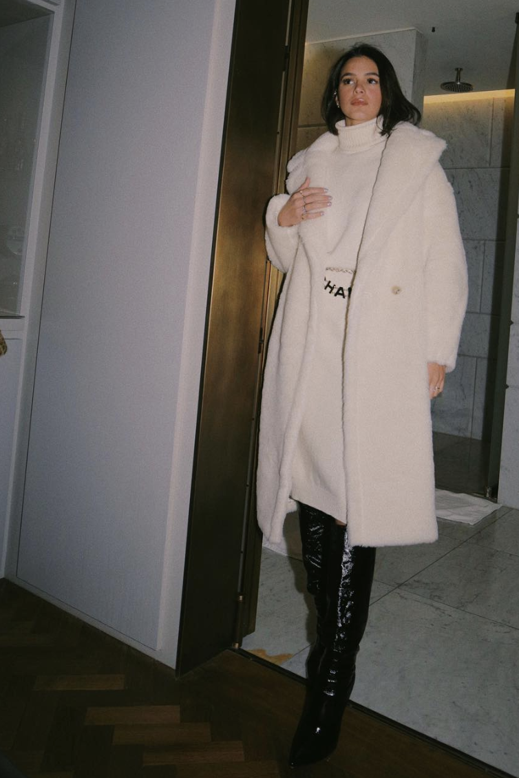 Estados Unidos: para assistir ao desfile da John John, na semana de moda de Nova York, Bruna optou pelo conjunto de verniz, arrematado pelas botas arrasadoras over the knee.