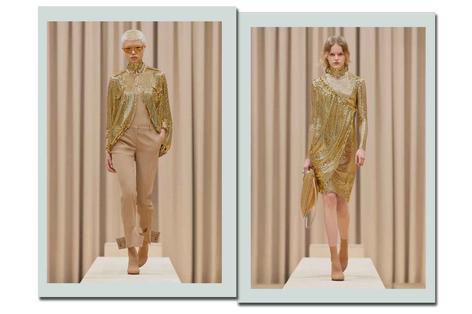 Esta última característica é expressada através de casacos e jaquetas que remetem a armaduras, com ombros destacados e faixas de proteção. A feminilidade não aparece de forma óbvia, com cinturas marcadas, babados e doçura – como imagina uma mente influenciada por esteriótipos de gênero -, mas se faz presente nos tons claros de uma paleta sóbria e nas formas criadas em estampas geométricas. Afinal, como questiona Riccardo Tisci com suas criações, o que realmente é o feminino?