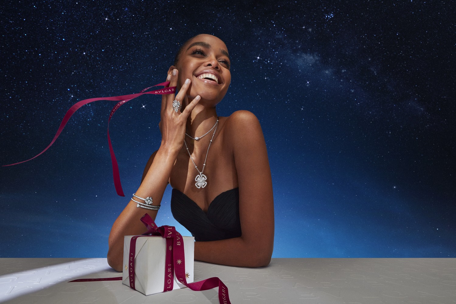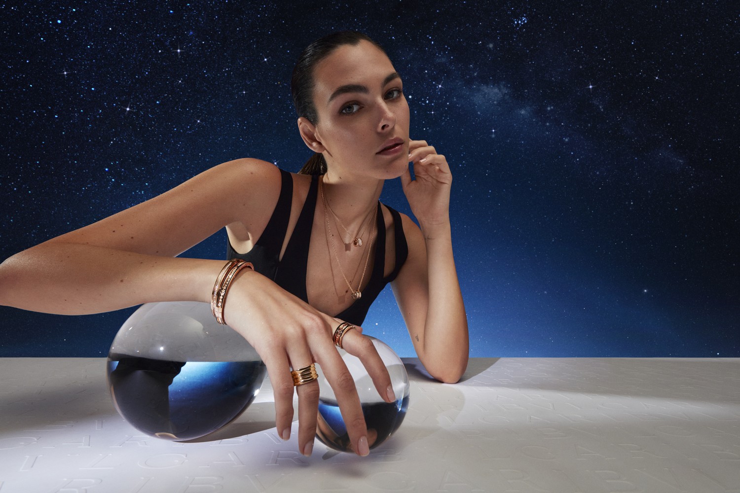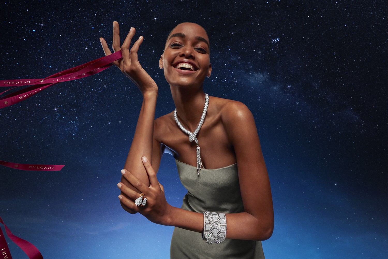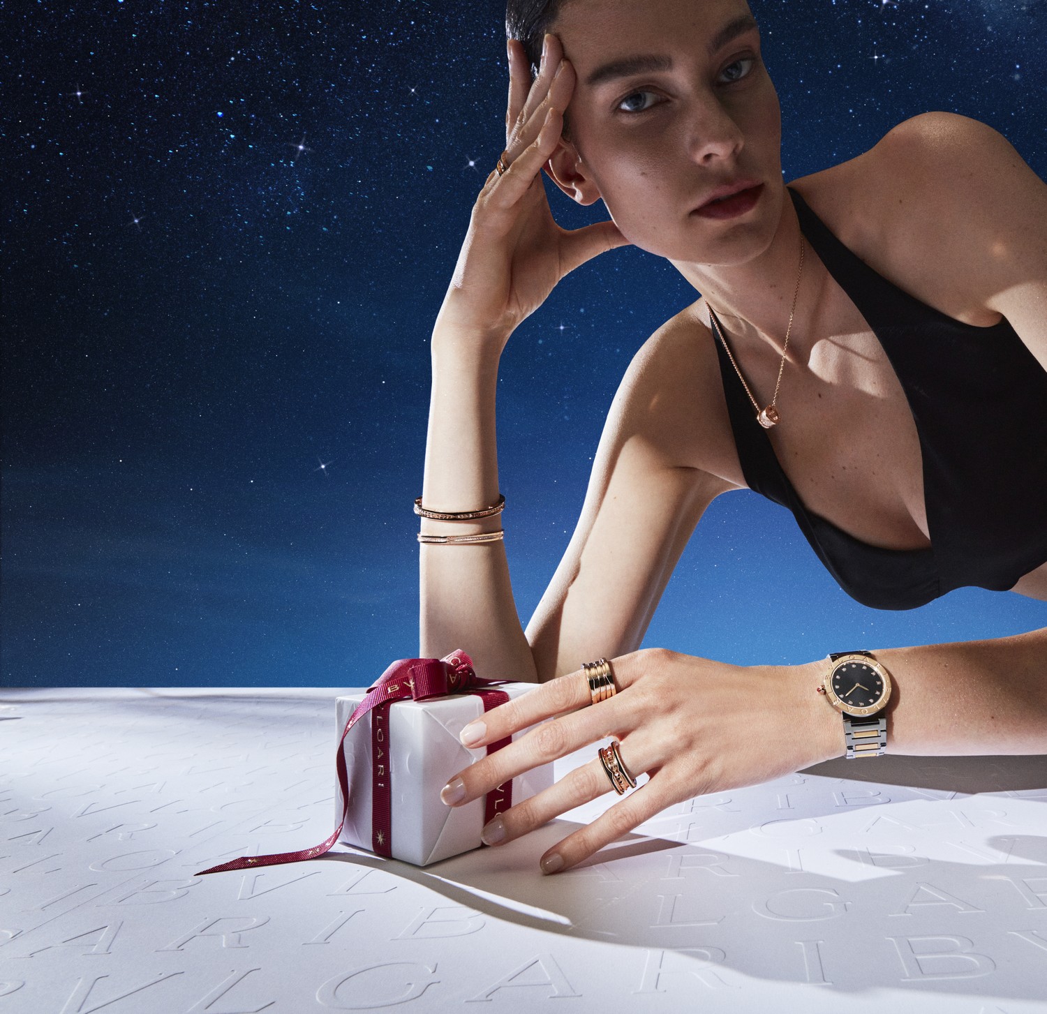 A campanha da coleção de final de ano da Bvlgari nos inspira a olhar para o céu. Em uma paisagem surreal, o padrão do logotipo infinito Bvlgari representa a propensão da marca para horizontes criativos sem fim, a inspiradora estrela de oito pontas Condotti e estrelas cadentes abraçadas pelo poder evocativo do céu representam as pequenas e grandes maravilhas que tornam a vida magnífica e as maneiras encantadoras que uma visão pode se tornar real.