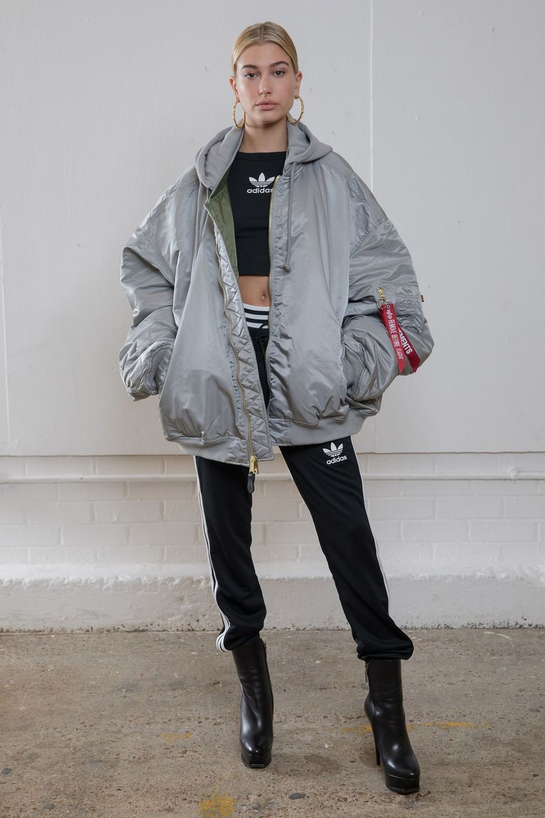 A modelo Hailey Baldwin compõe o look com jaqueta oversized e brincos de argola.