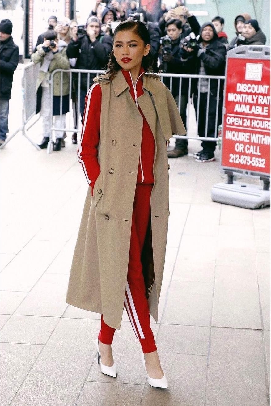 Em um look mais inusitado, Zendaya combina o moletom com escarpins brancos e um trench coat repaginado.