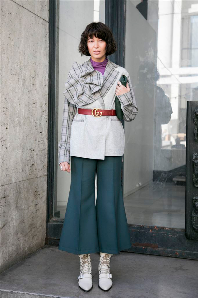 No comprimento midi, a calça flare verde petróleo é up to date. E mesmo mais curta, a peça continua alongando o visual – que é construído por camadas. O estilo da calça mais curta ainda permite o uso de calçados trabalhados, como a bota off-white.