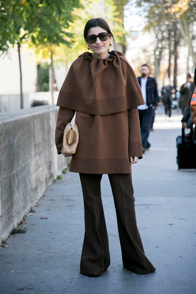 Os tons terrosos são pura finesse, principalmente o marrom, que pode sim substituir o preto. Para garantir elegância, a calça flare equilibra a blusa com o bolero em babados. E ao contrário do look com a calça verde petróleo, a peça costuma ir até o chão. Por isso, sapatos de salto são recomendados, para que a barra longa fique rente ao calçado.