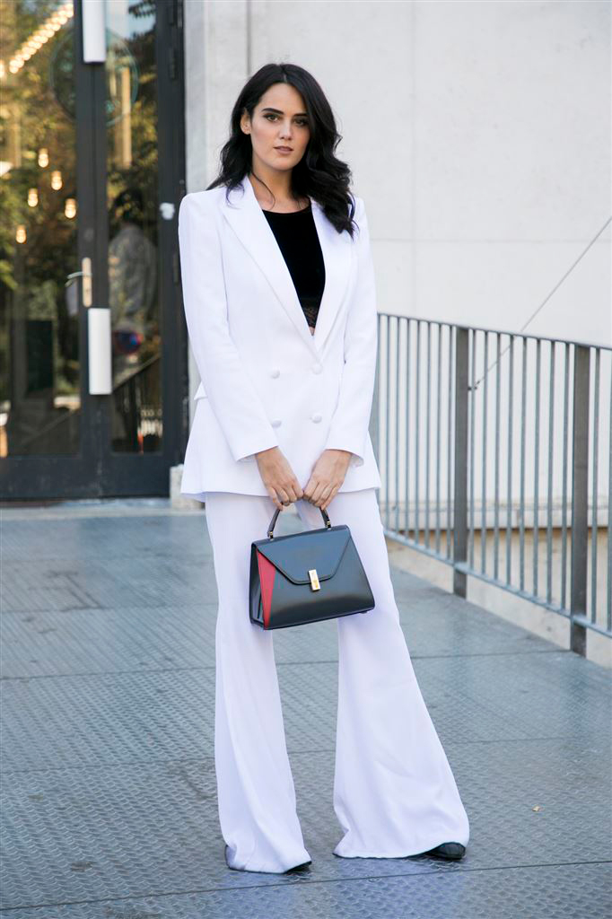 Não existe nada mais chique do que um look all white. E a calça flare cabe perfeitamente neste estilo: o branco é conhecido por aumentar a silhueta – oposto do all black. E, graças a calça flare, o bloco monocromático permite a construção de um visual mais alongado. E dica: o blazer com decote em V também é um ótimo recurso para garantir a longevidade do look, principalmente quando é ressaltado pela blusa preta, por baixo.