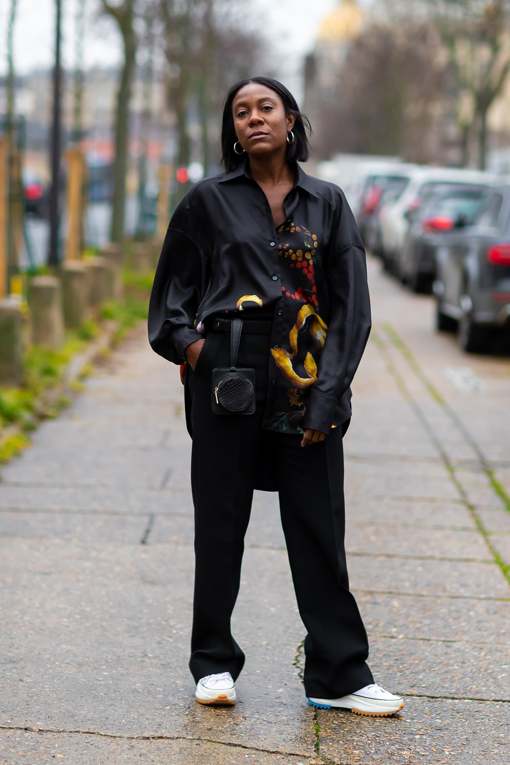 Já para o visual all black, a camisa foi colocada para dentro da calça parcialmente. E, onde não tem tecido solto, uma bolsa redonda no estilo pochete foi utilizada para arrematar o look! Pura informação de moda e conforto.