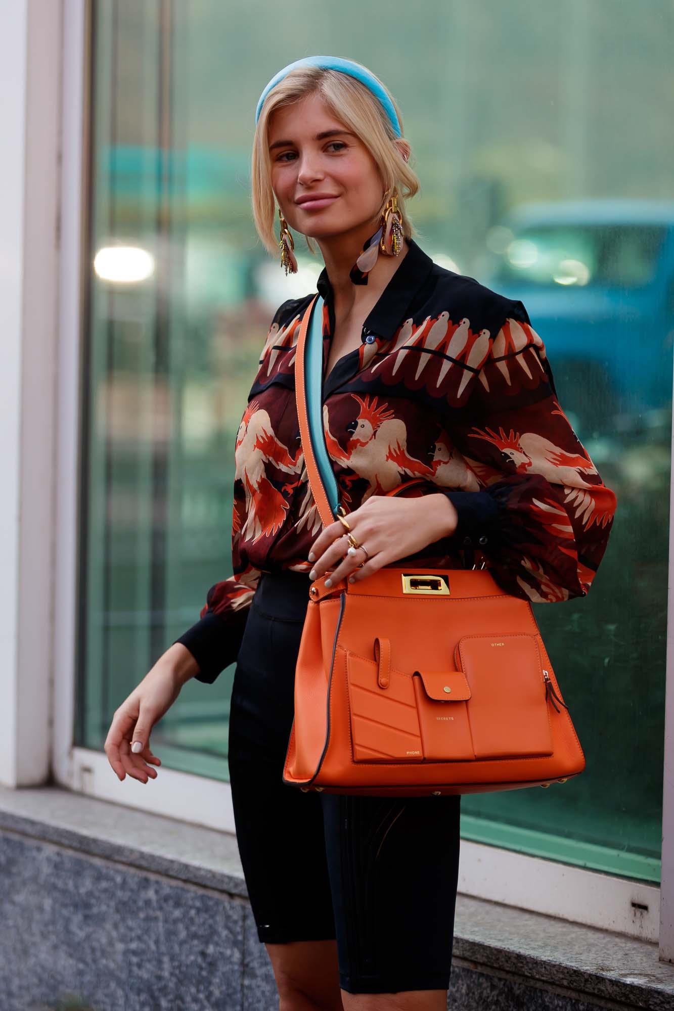A camisa de seda preta e laranja foi colocada para dentro do shorts de ciclista, o que ajudou a enfatizar o empoderamento que a peça transmite. O toque da bolsa Fendi cruzada enriqueceu o visual, ao mesmo tempo que frisou o mood esportista do look, com sua vibe utilitária.