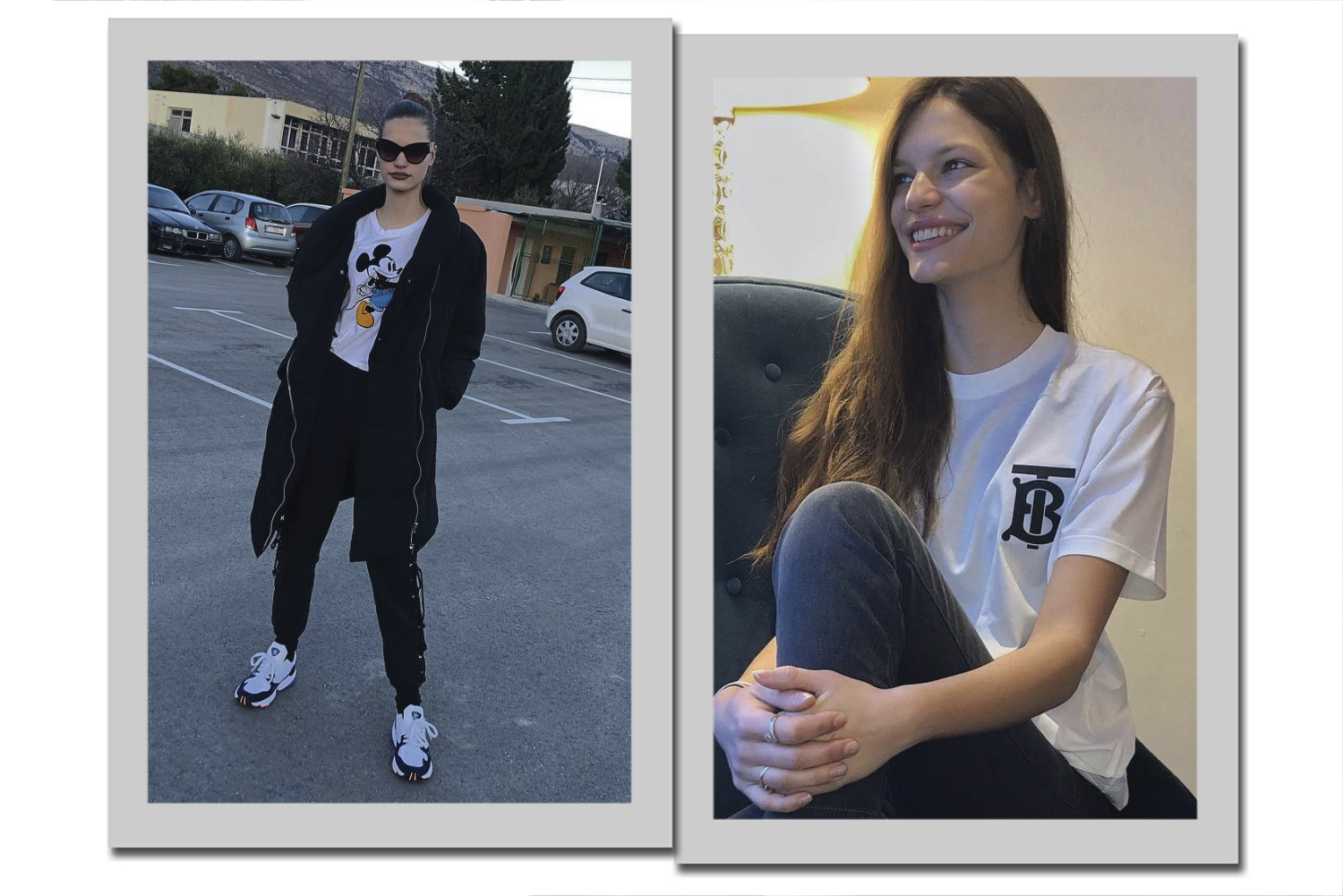 A modelo Faretta usou a camiseta da Burberry com o jeans escuro, e arrasou. A camiseta branca estampada com o Mickey também foi motivo de street.