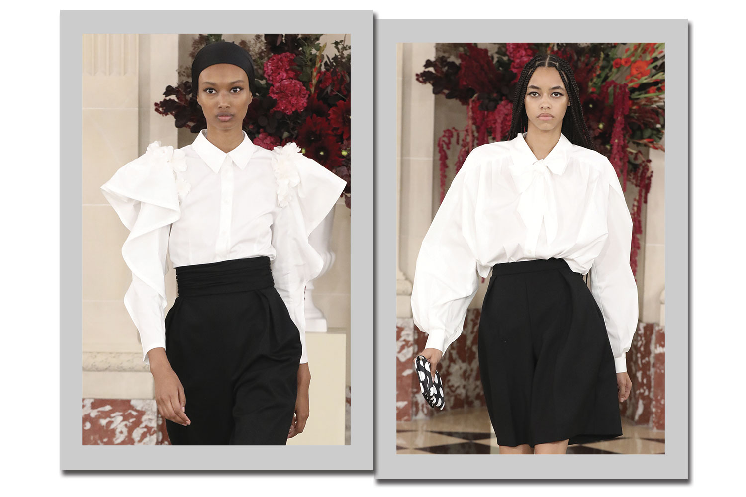 Características marcantes da label aparecem na passarela, como as camisas brancas, poás, babados e muito volume. O desfile começa com uma sequência de look em P&B, indo desde básicos com camisa branca e calça preta até os vestidos de festa.
