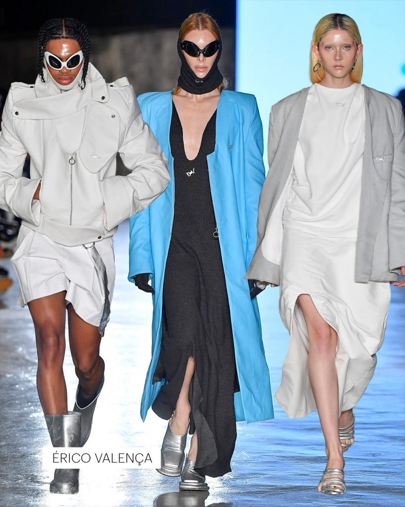 Quem também orbitou pelo Space Age foi Érico Valença. Inspirado nos avós, reformulou o visual da família com uma lente futurista. As peças em couro de sarja resinada, técnica desenvolvida por ele mesmo, são o ponto de aterrissagem.