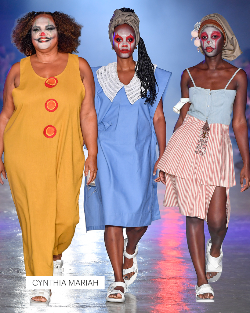 Cynthia Mariah trocou o clima espacial por um picadeiro: modelos vestindo fantasias de palhaço deram o tom da coleção. As listras se destacam e guiam o olhar.