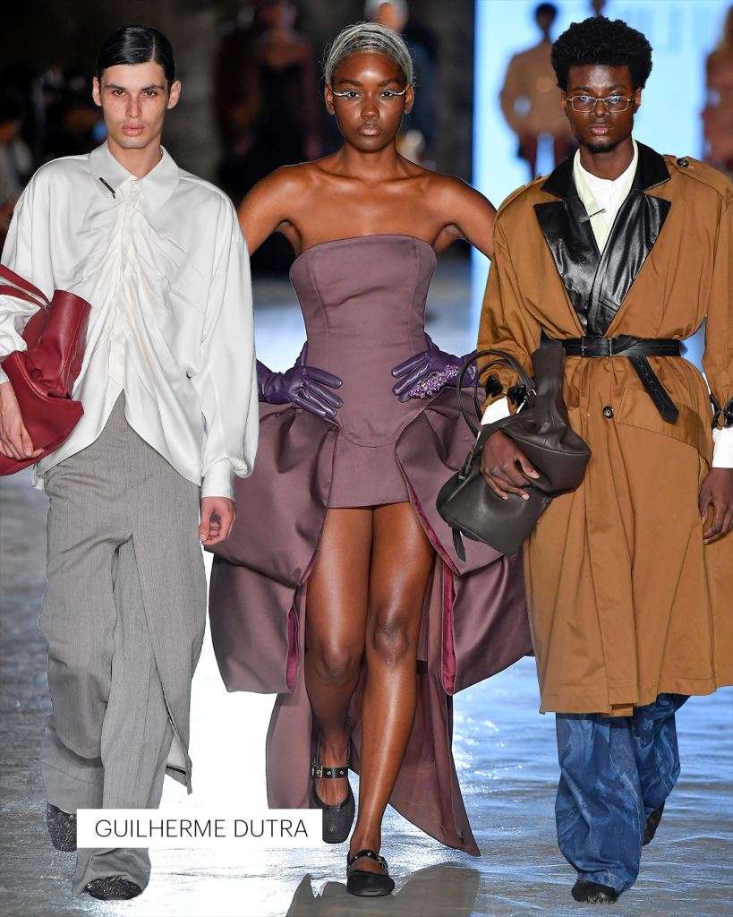 Guilherme Dutra, vencedor do Desafio Sou de Algodão, desfilou “Poupée”, uma homenagem à avó. Inspirado em bonecas francesas, criou volumes e silhuetas que costuram memória e imaginação.