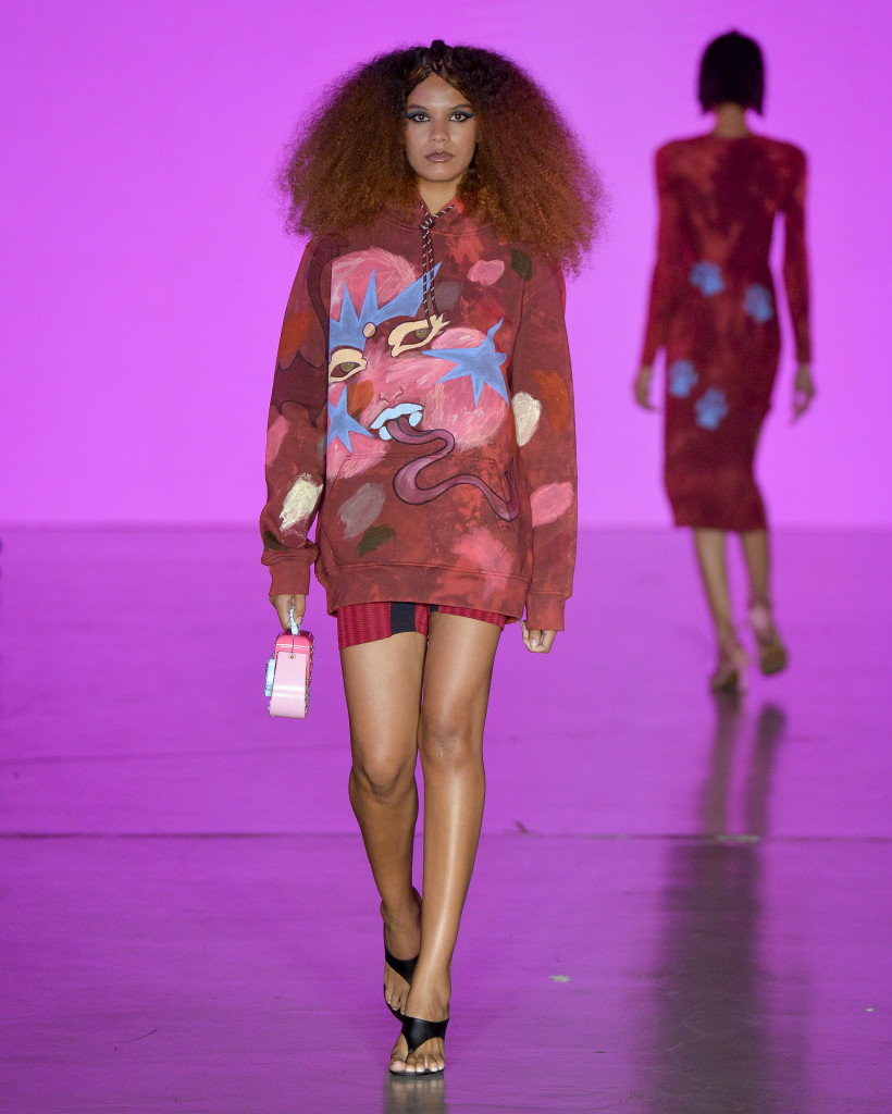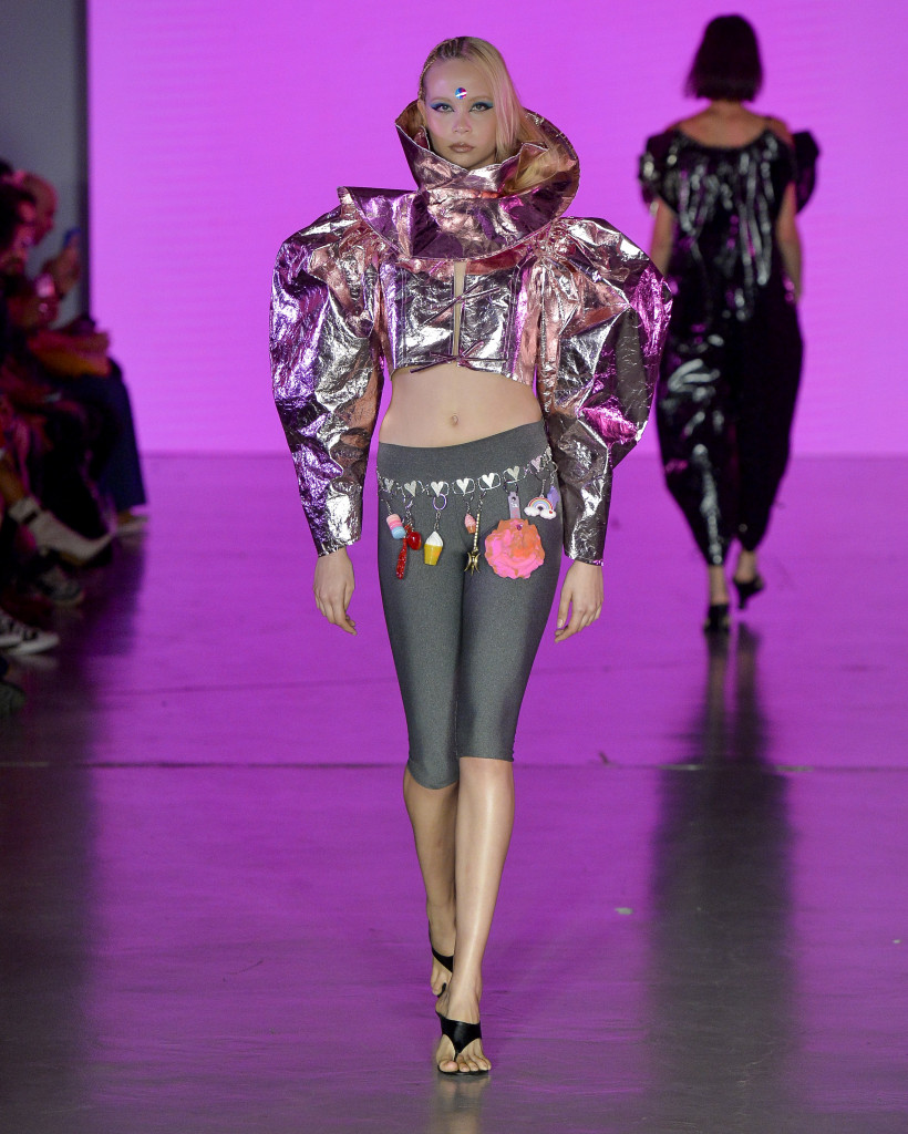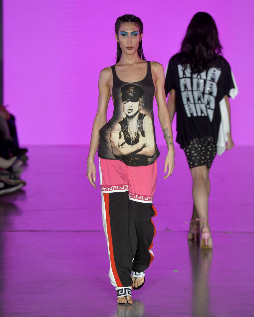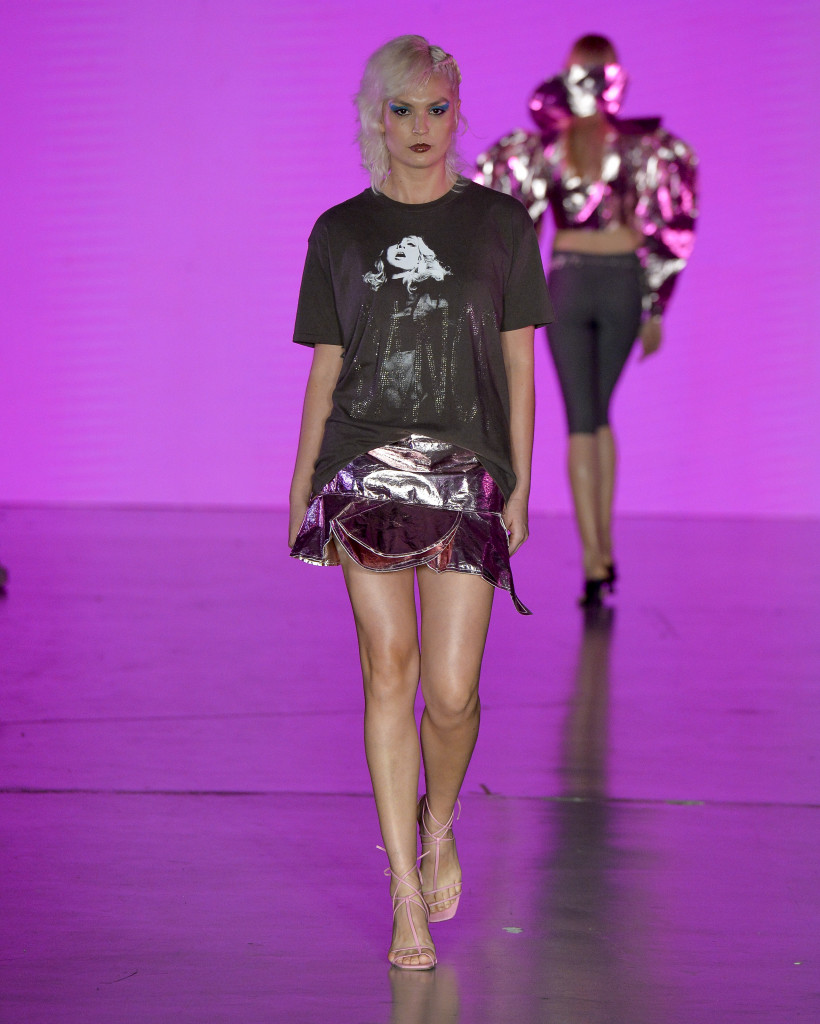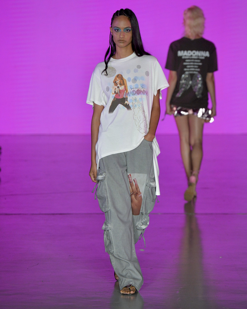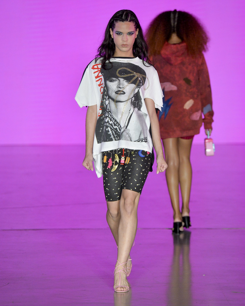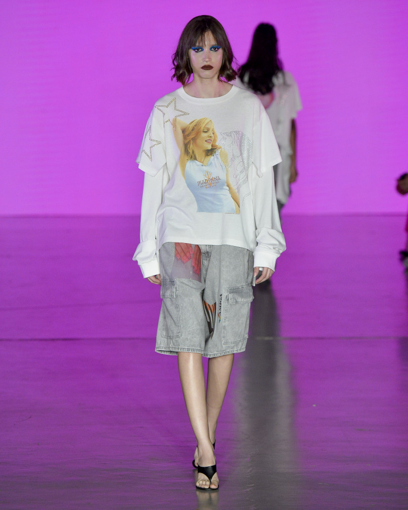 Na passarela, cada peça atua como superfície tradutora entre estímulo e experiência, em sintonia com princípios de UI/UX. Sobreposições, texturas híbridas, simultaneidade e o rosa simbólico aparecem reorganizados pela lógica de camadas e sistemas dinâmicos inspirados pelo Amiga. Dentro dessa atmosfera neo-oitentista, as camisetas e peças estampadas com imagens de Madonna reforçam o mergulho na era de ouro dos anos 80, evocando a estética pop, o espírito DIY e o imaginário visual que moldou tanto a cultura digital nascente quanto a moda da década.