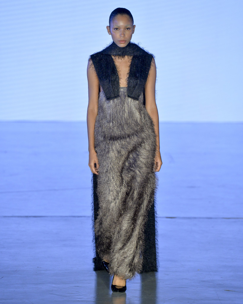 A coleção se apoia em formas geométricas marcadas — mangas e ancas arredondadas, colunas rígidas que se traduzem em vestidos e saias alongadas — criando uma arquitetura do corpo tensionada pela escolha dos materiais. Lã, pelúcia, veludo, acetinados e brilhos compõem um repertório tátil que mistura sofisticação, exagero e sensualidade. A silhueta de “dunas”, destaque da última temporada, retorna em novas bases e texturas, consolidando-se como código identitário da marca.