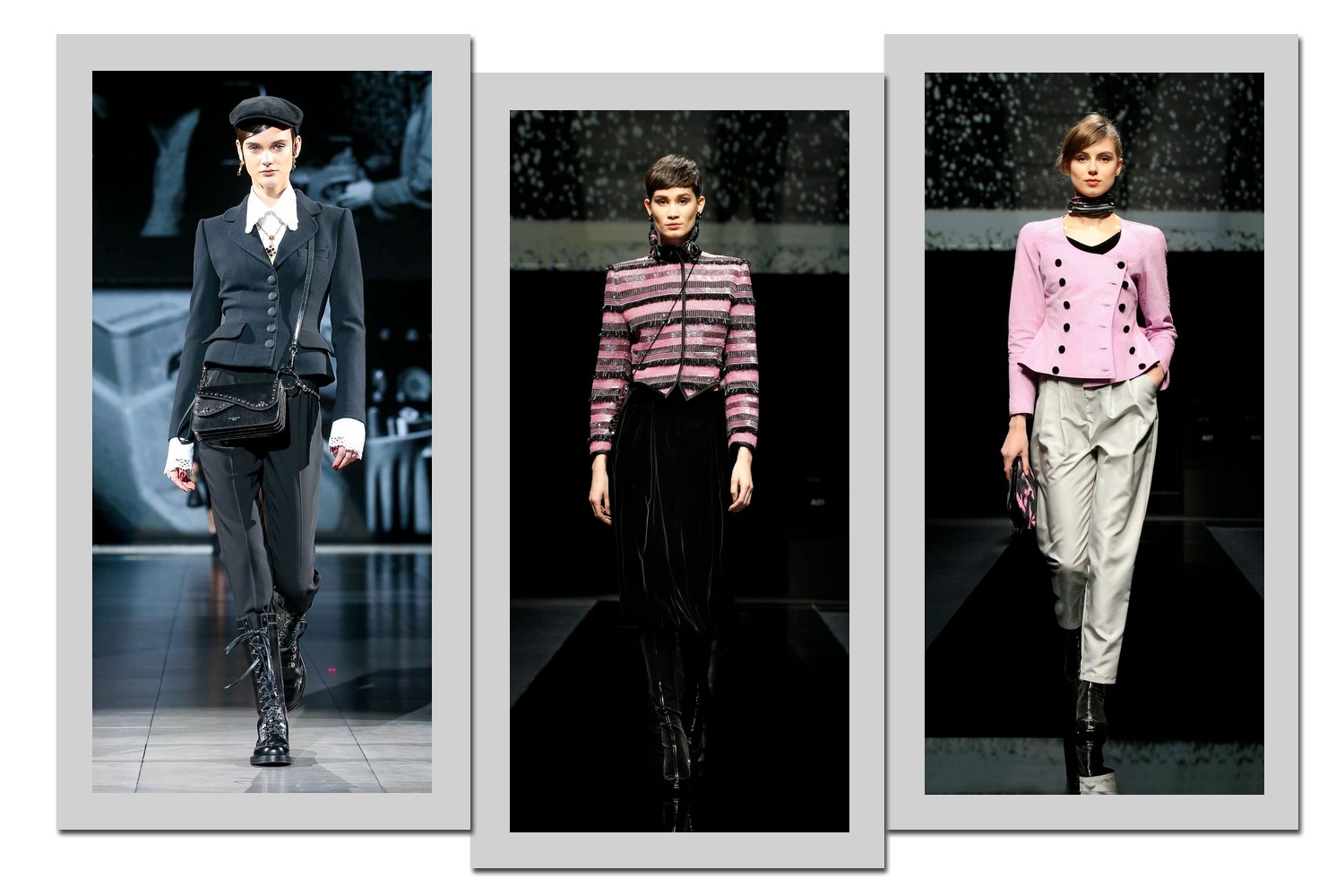 Uma espécie de blazer mais curto, o spencer reina na passarela da Emporio Armani. Tanto versões mais acinturadas quanto algumas mais folgadas, este tipo de peça é uma opção para inovar o terninho.