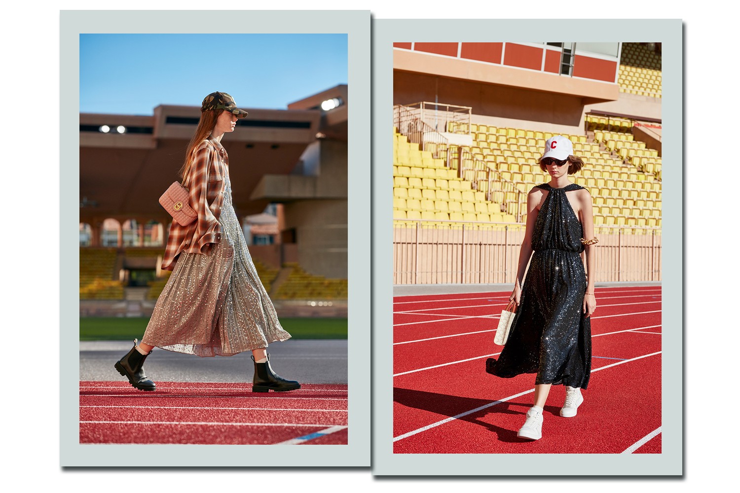 Vestidos de paetê e babados levaram o mood de festa para a passarela, complementado pelo maior aposta da marca com tênis e bonés.