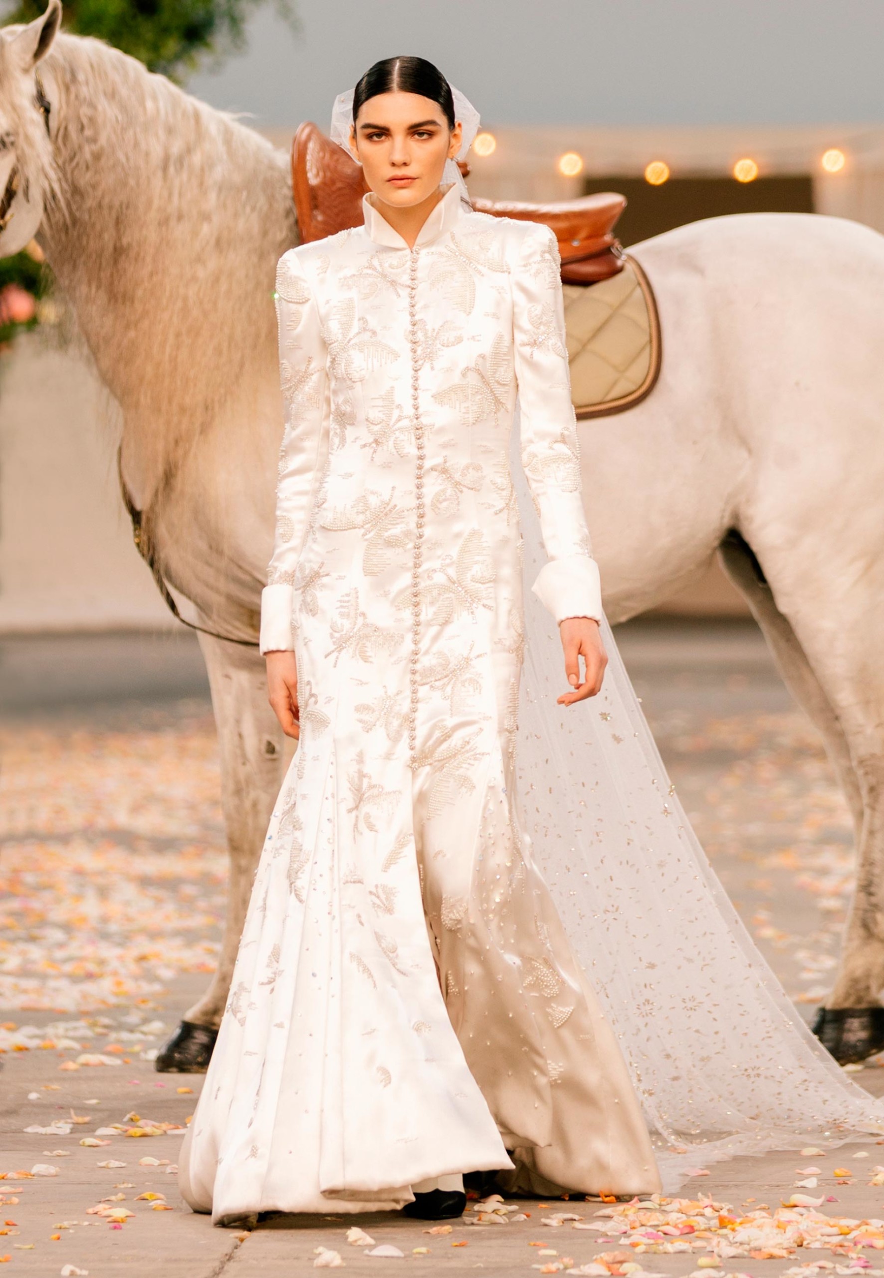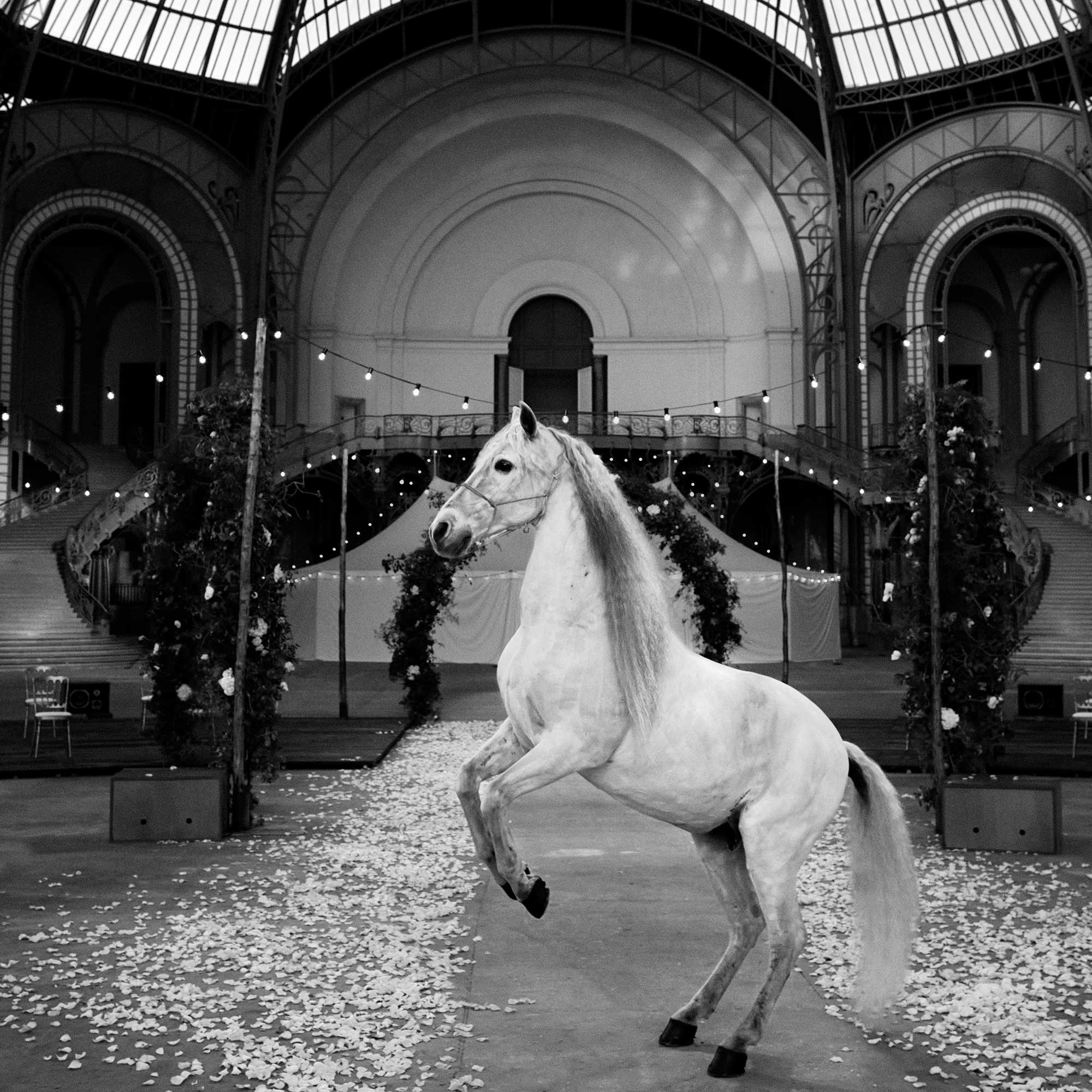Para esta temporada de alta-costura, a Chanel decorou o Grand Palais como se fosse um altar de casamento no campo, com direito a cavalo. Lindas flores chamaram a atenção.