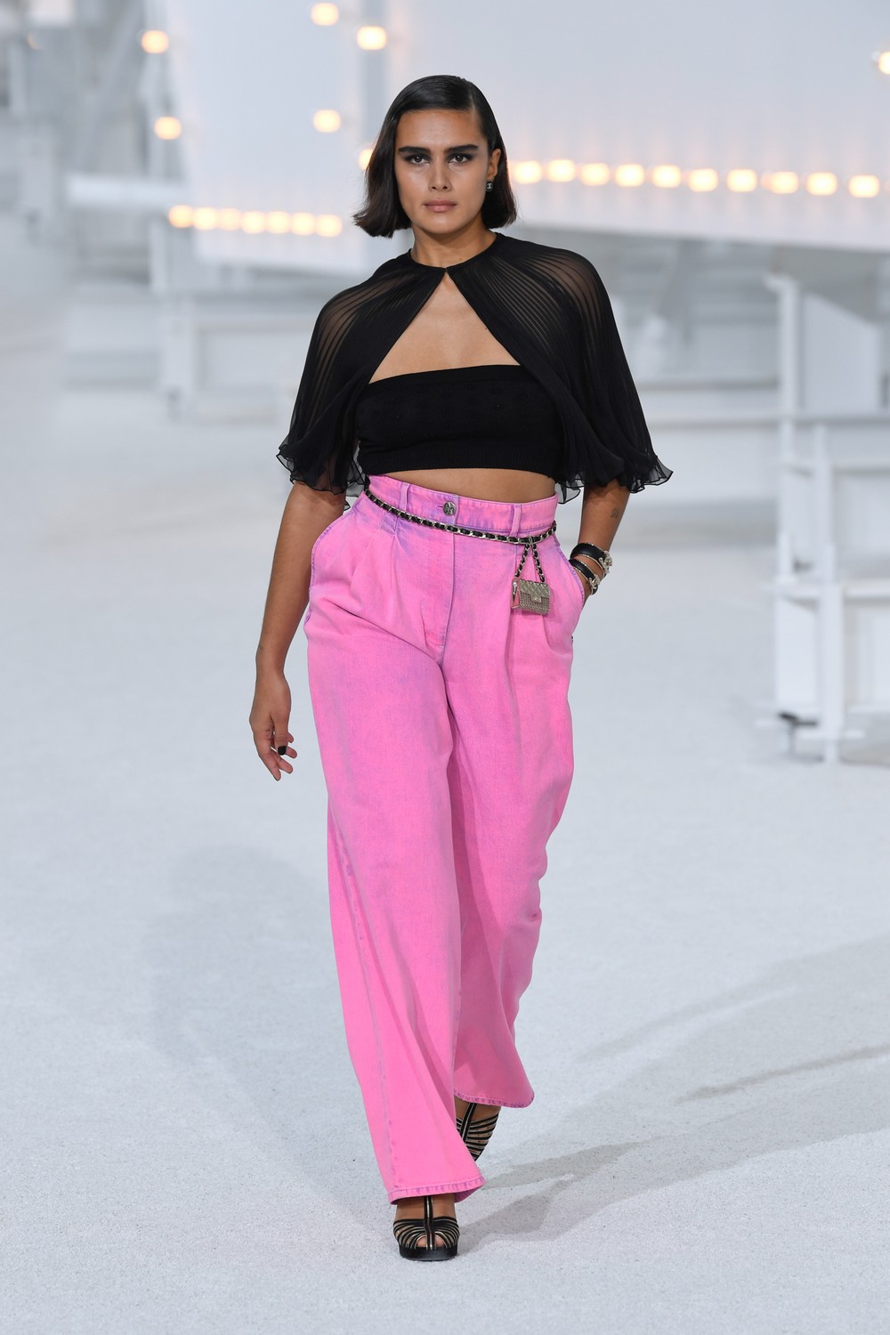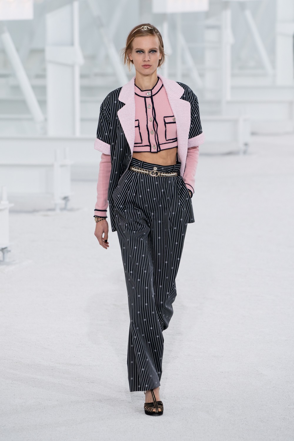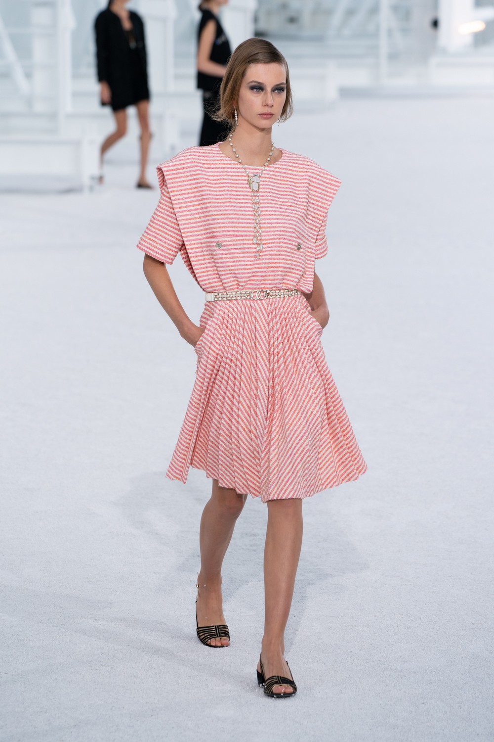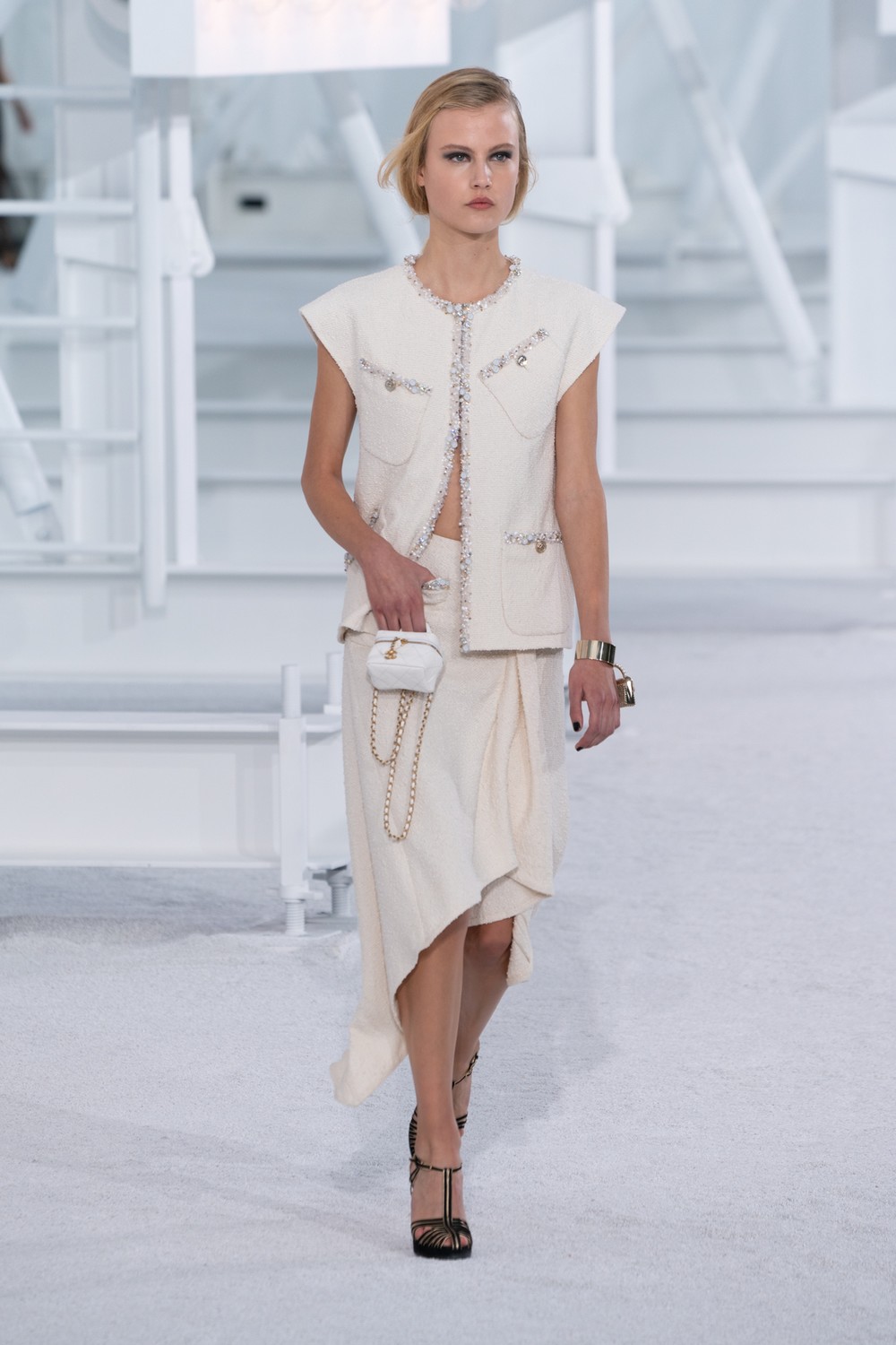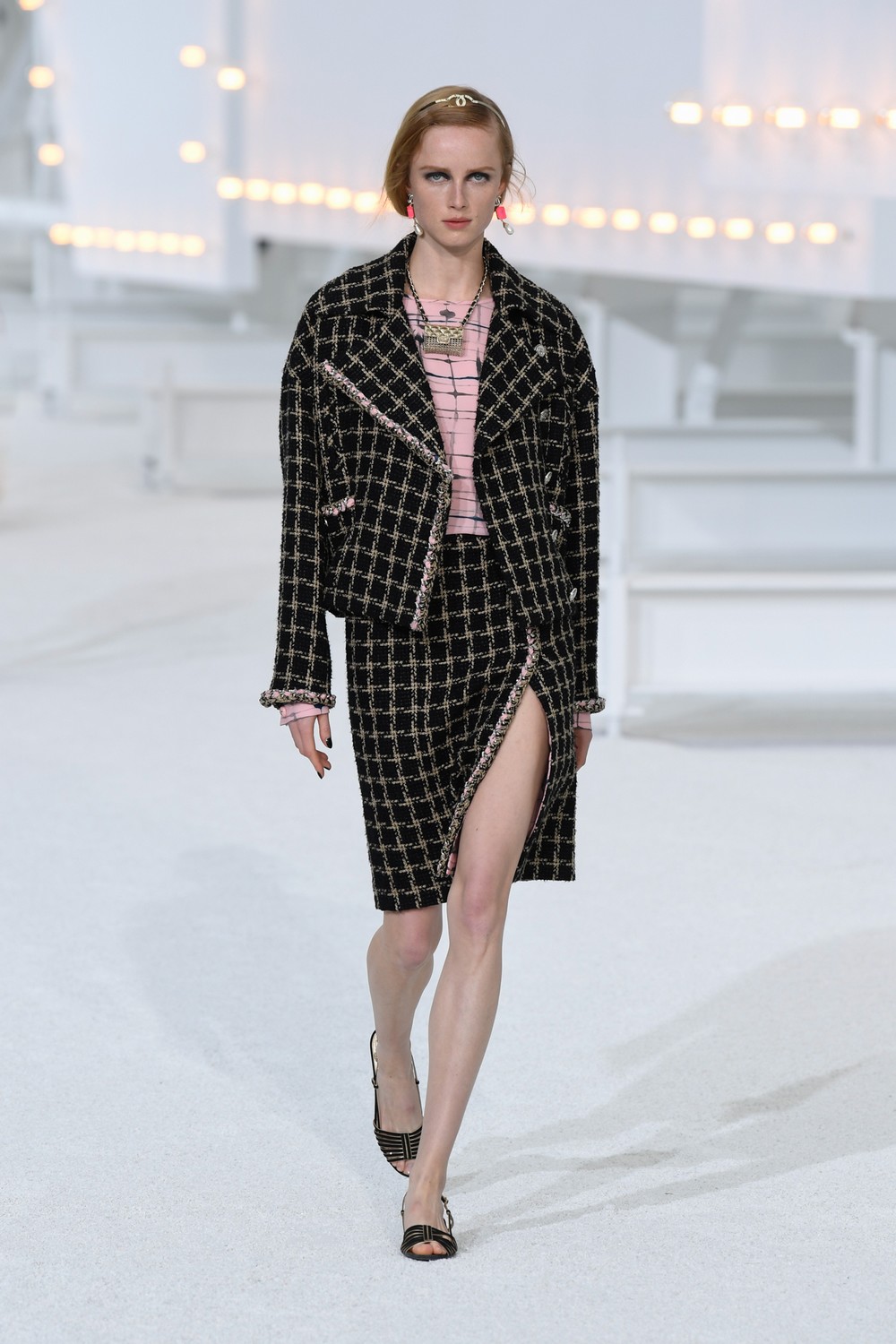 No resultado desse mergulho em mais um capítulo da herança cultural da marca, a diretora criativa, Virginie Viard, passeou entre a silhueta fluida em vestidos ao corte quadrado de jaquetas oversized, do clássico tailleur em tweed ao terninho paetizado com blazer cropped.