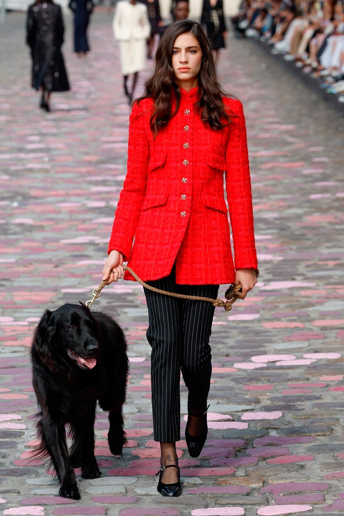 Ainda mais fun? Uma modelo que cruzou a “passarela” (decorada com paralelepípedos pintados de rosa) ao lado de um cachorro, no tom de leveza das criações de Virginie Viard nessa temporada.