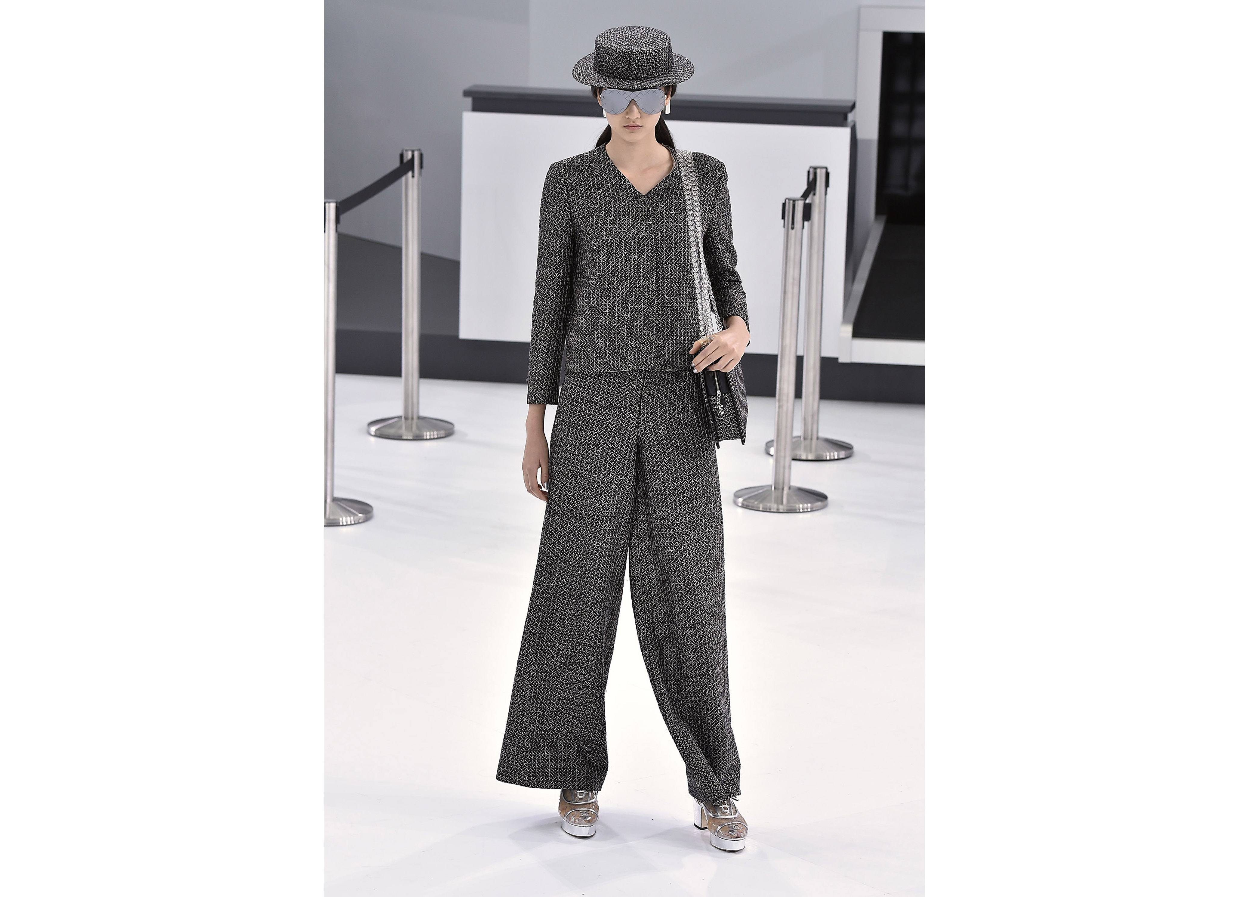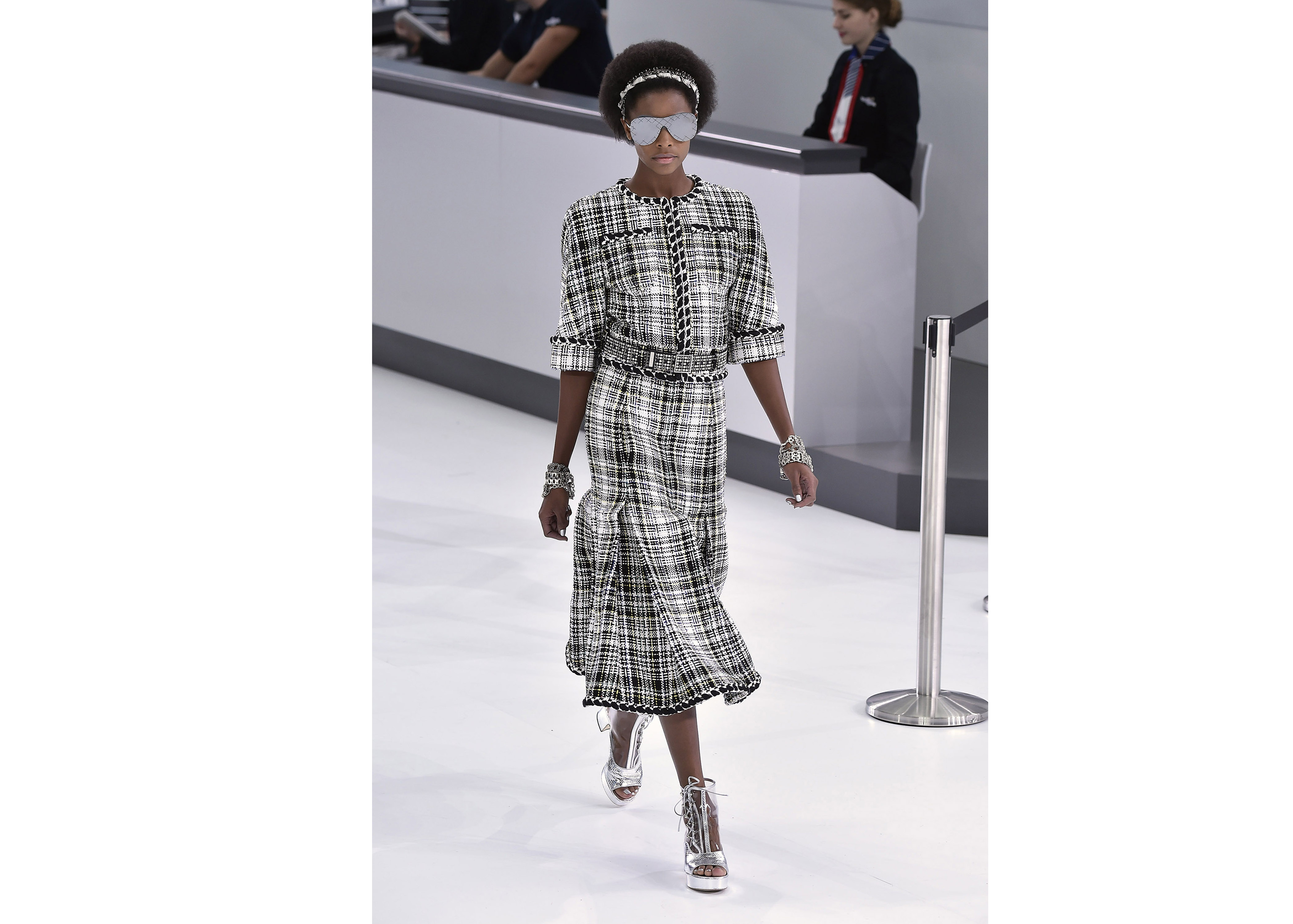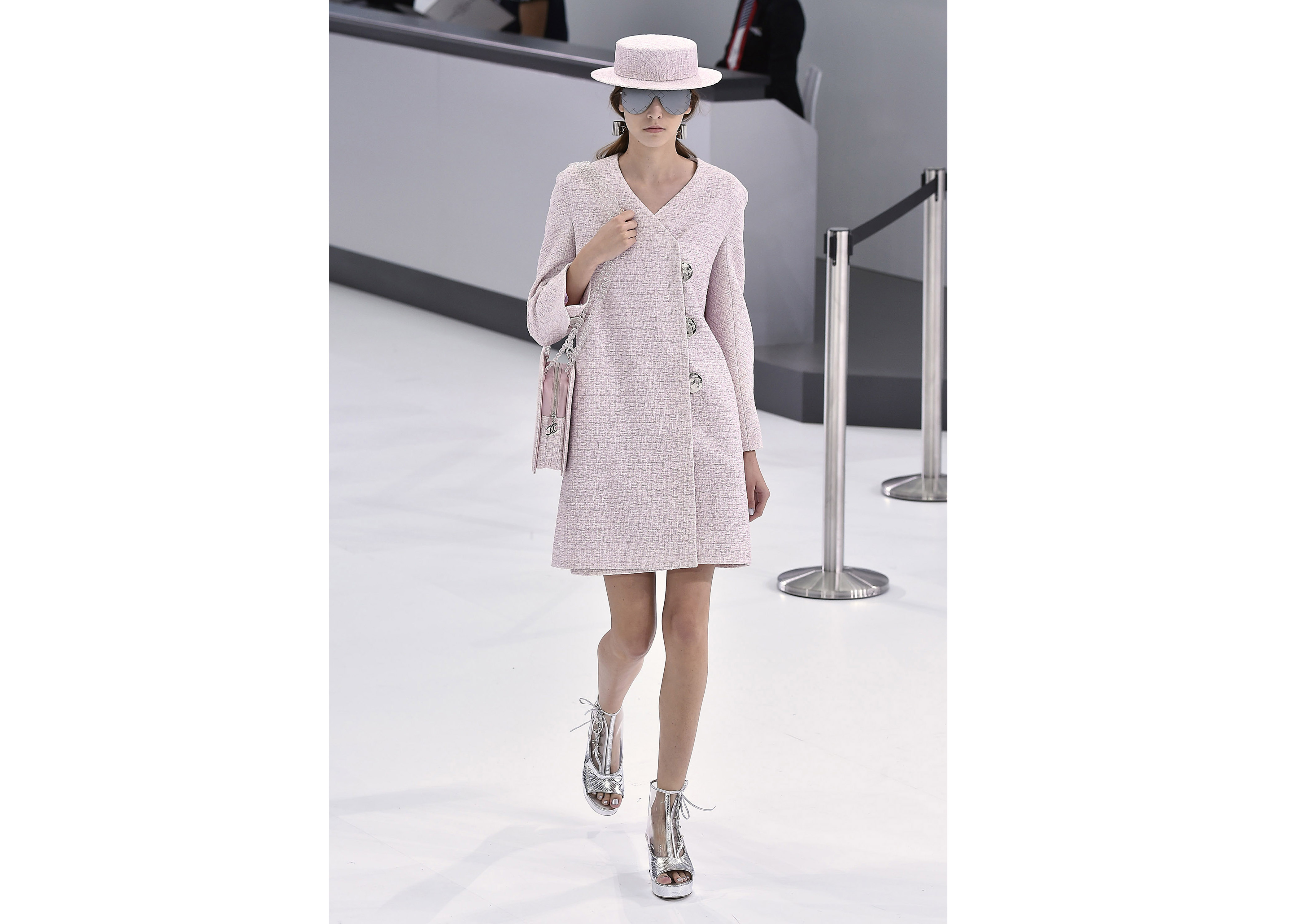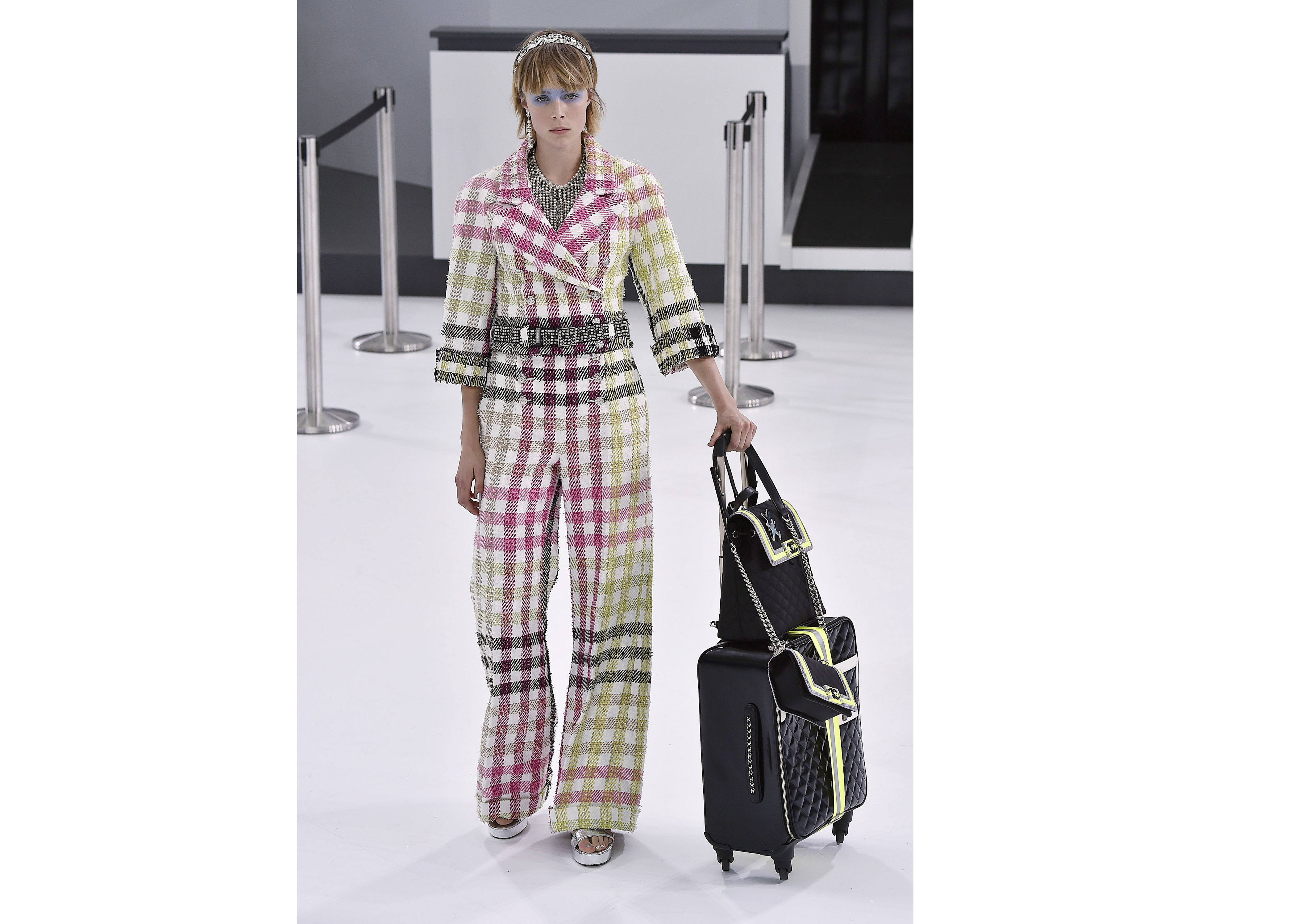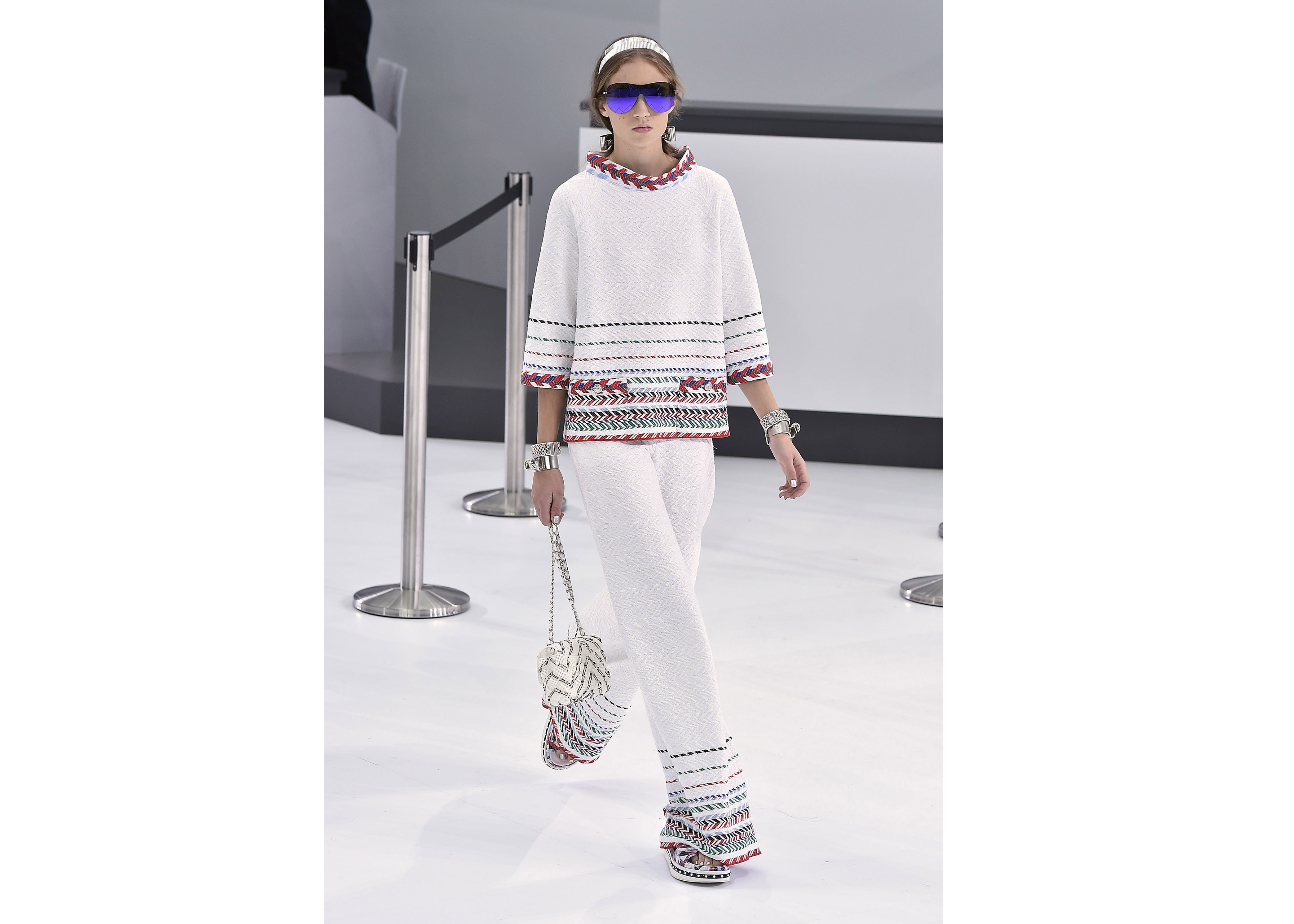 Se ainda restava alguma dúvida sobre a urgência escapista da temporada, Karl Lagerfeld a eliminou por completo. Para o verão 2016 da Chanel, criou um terminal de embarque em pleno Grand Palais e idealizou o uniforme da viajante de luxo sobre as lentes de Coco Chanel – ou quase. Este uniforme não é muito diferente daquele visto em qualquer aeroporto: calças soltas e confortáveis tipo moletom, suéter amarrado na cintura, jaquetas afastadas do corpo, sandálias baixas com meias e os óculos de sol à prova de jet-lag. Só que aqui, as pantalonas e seus casaquetos são de bouclé; a jogging pant, de cashmere; o vestidos amplos, de seda; e as rasteiras, decoradas com pérolas.