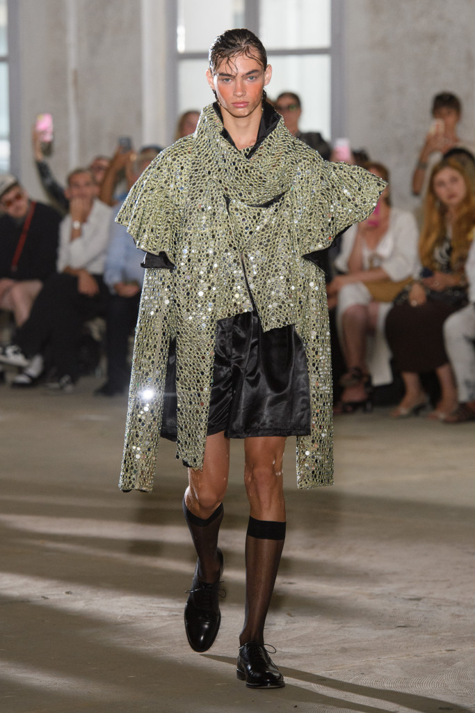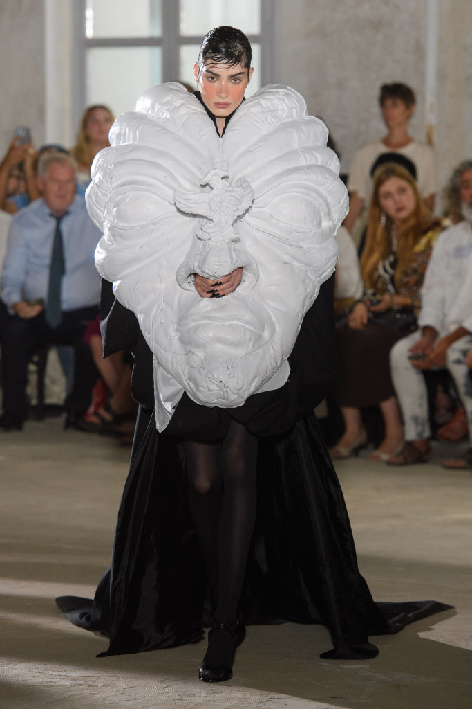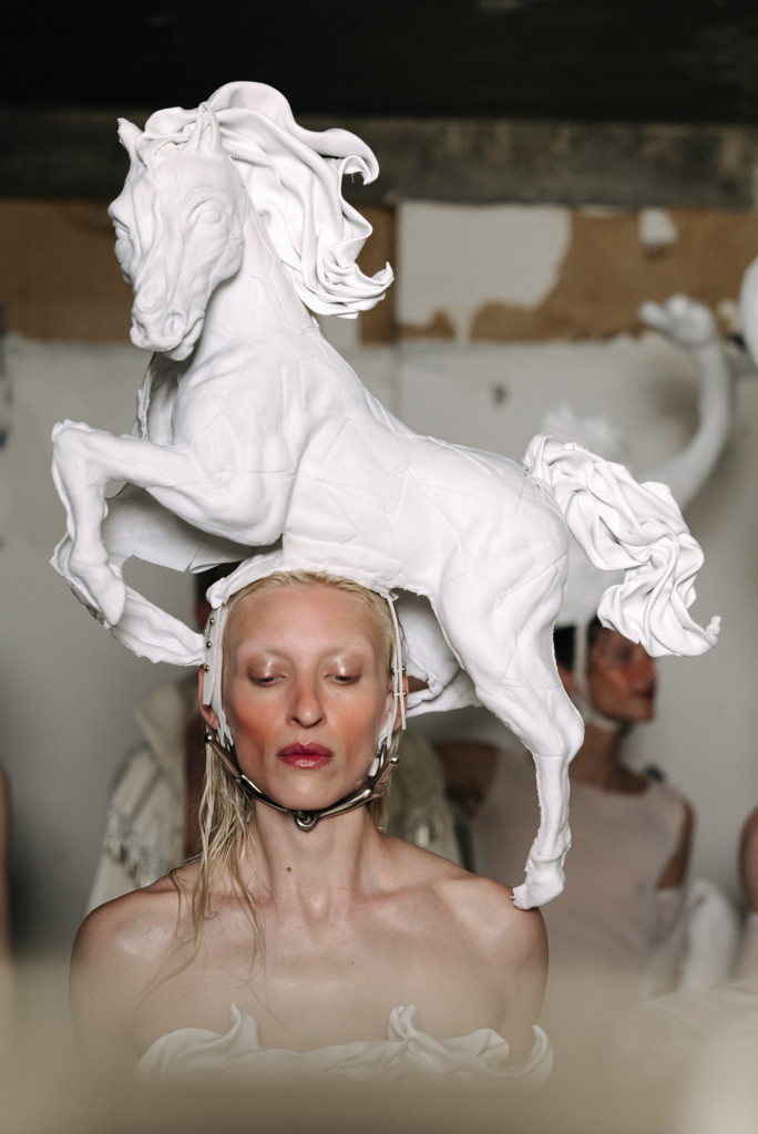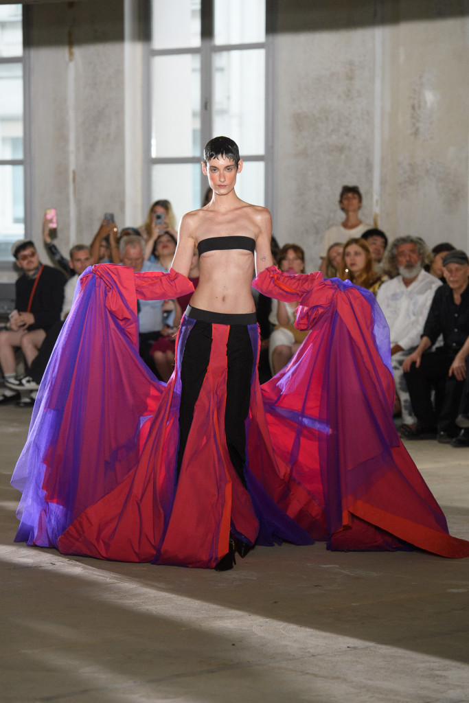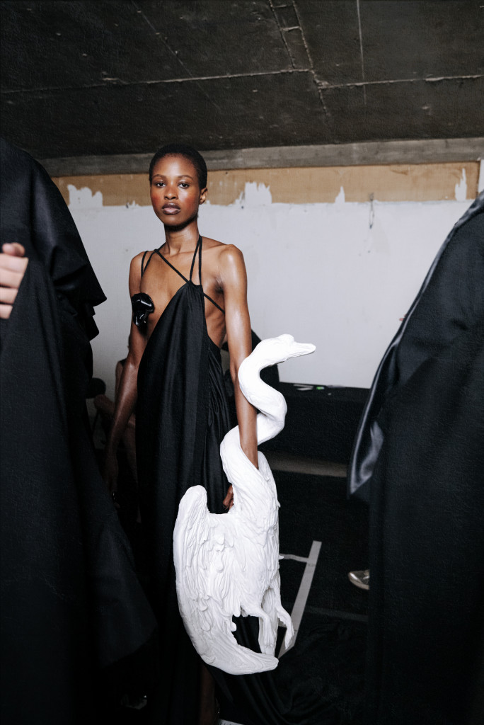 “A narrativa dialoga muito com meu próprio processo criativo. Há um mélange de estilos, de brutalidade e sofisticação”, no que ele também revela como uma representação da liberdade que surge da pressão. Em sua própria concepção, há a mesma aura teatral que, em outros desfiles da temporada (ele cita Schiaparelli, Viktor & Rolf, KidSuper e outro estreante, Thom Browne), também apareceu.