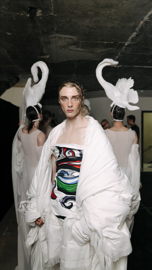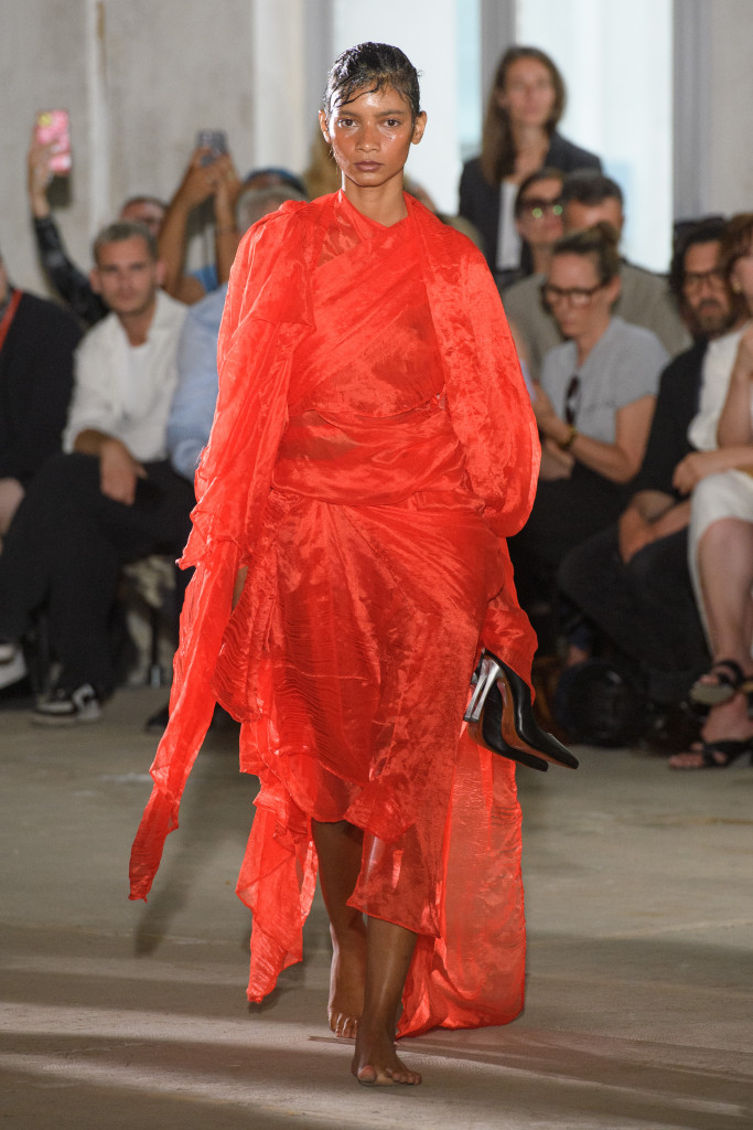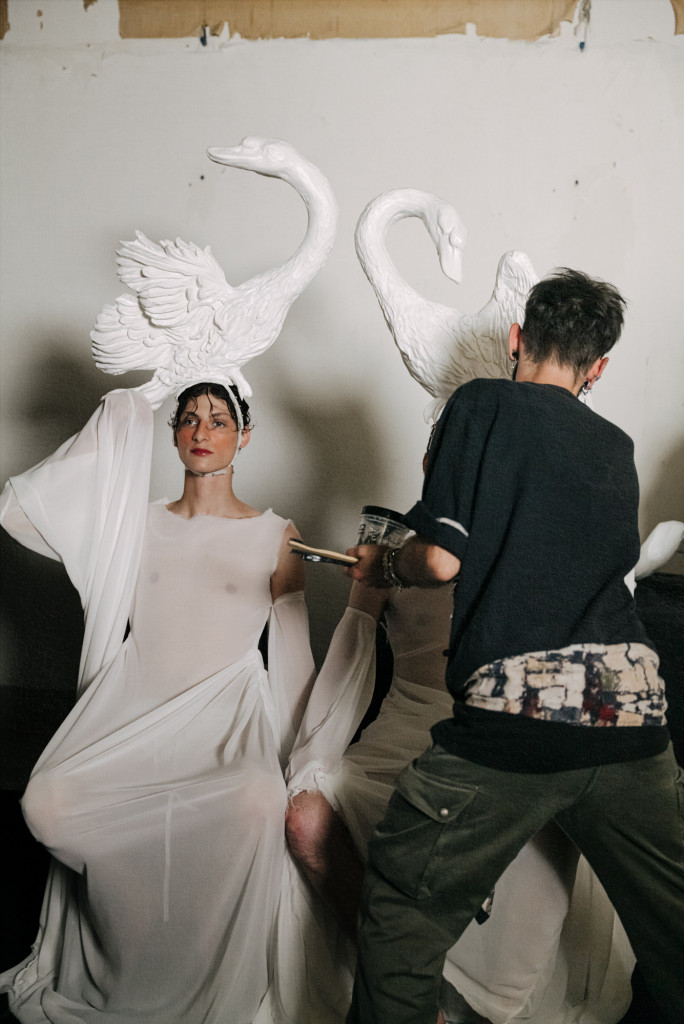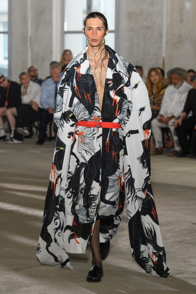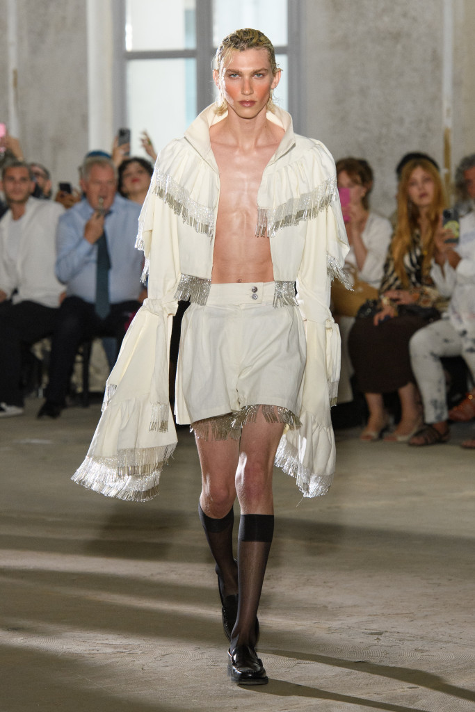 “A narrativa dialoga muito com meu próprio processo criativo. Há um mélange de estilos, de brutalidade e sofisticação”, no que ele também revela como uma representação da liberdade que surge da pressão. Em sua própria concepção, há a mesma aura teatral que, em outros desfiles da temporada (ele cita Schiaparelli, Viktor & Rolf, KidSuper e outro estreante, Thom Browne), também apareceu.